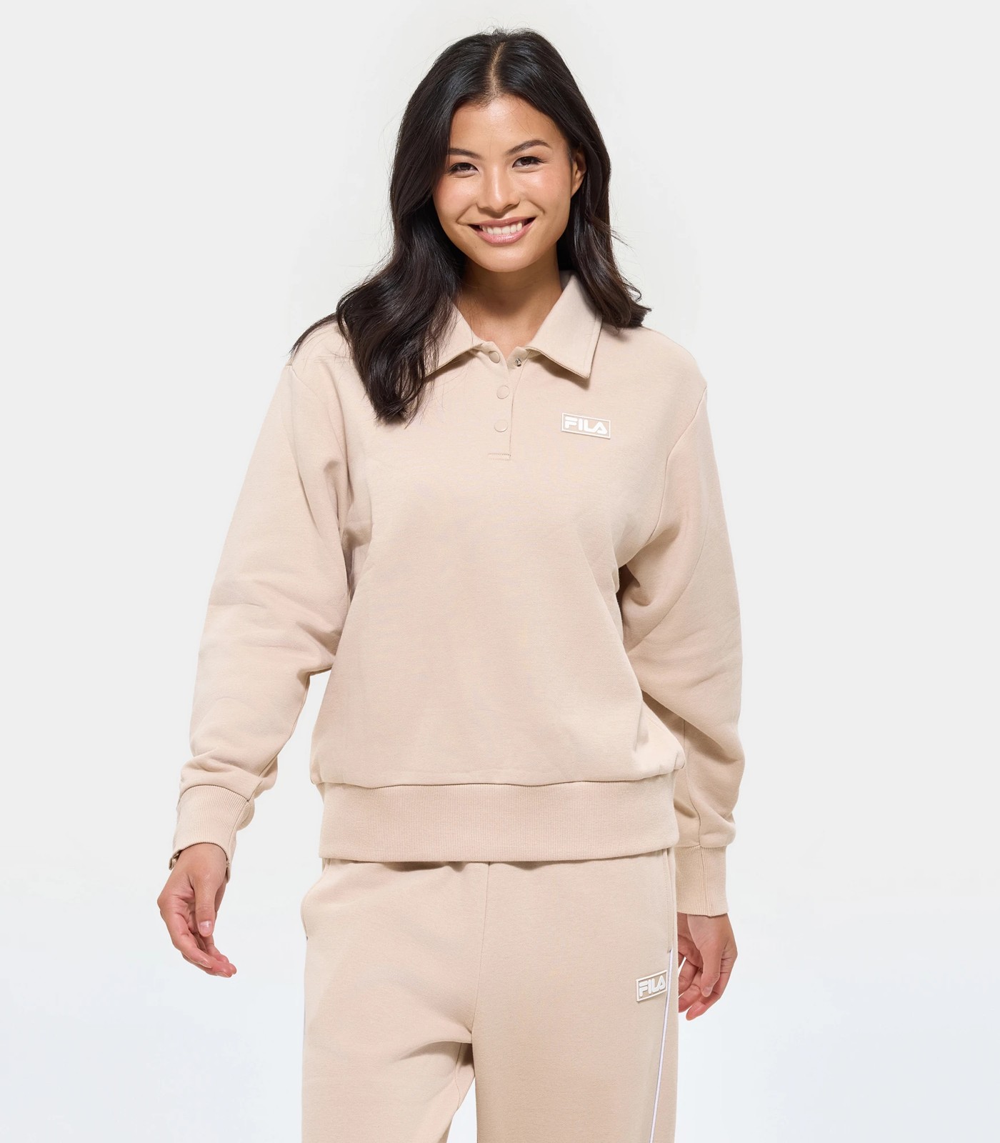 Wrap yourself in comfort with the Fila Pearl snap crew. Crafted from soft Cotton/Polyester slightly Brushed French Terry, ensuring warmth and cosiness. The crew features a Fila rubber badge to the left chest, comfortable ribbed cuffs and hem, and tonal snaps on collar and cuffs. Elevate your everyday wardrobe with the Fila Pearl snap crew today! This crew is the perfect addition to your current active or leisurewear wardrobe. Style with the Pearl trackpant (sold separately) for a matching comfy set. This crew is perfect for layering or dressing up or down with your favourite bottoms. This crew pairs seamlessly with your activewear, effortlessly transitioning from workouts to and from the gym to everyday wear. With its elevated quality and slightly oversized fit, it redefines comfort and functionality and will be your new go-to crew. Don’t miss out - add this crew to your collection today!