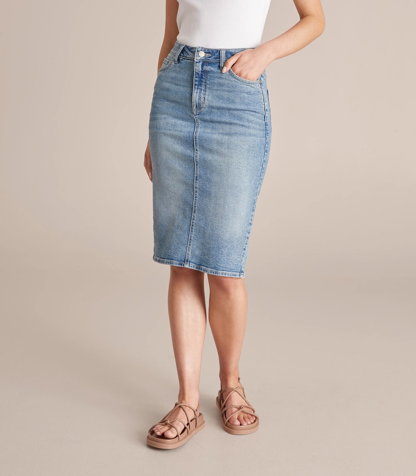 Get out and about in the must have pencil denim skirt - on trend for this season. It is knee length, a 5 pocket design for all of your essentials and a classic pencil cut to flatter your shape.