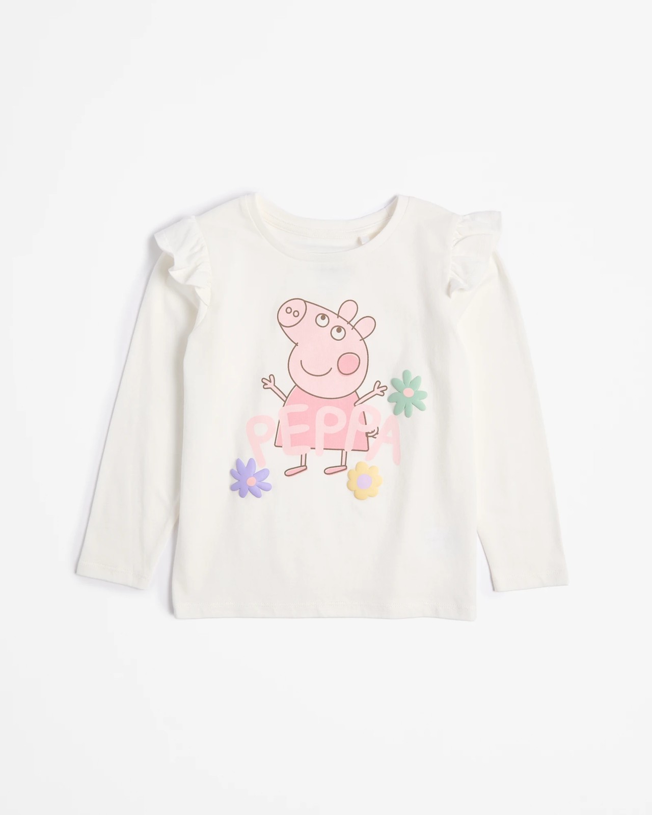 Delight your little one with this adorable Peppa Pig Frill Long Sleeve Top. Made from soft cotton for everyday comfort, this regular-fit cream top features a cheerful Peppa Pig print on the front. Designed with a crew neck and long sleeves accented with charming shoulder frills, it’s perfect for playdates and adventures. A straight hem ensures easy wear, making it a versatile addition to your child's wardrobe. Add this cute Peppa Pig top to your basket today and watch your child's face light up with joy.