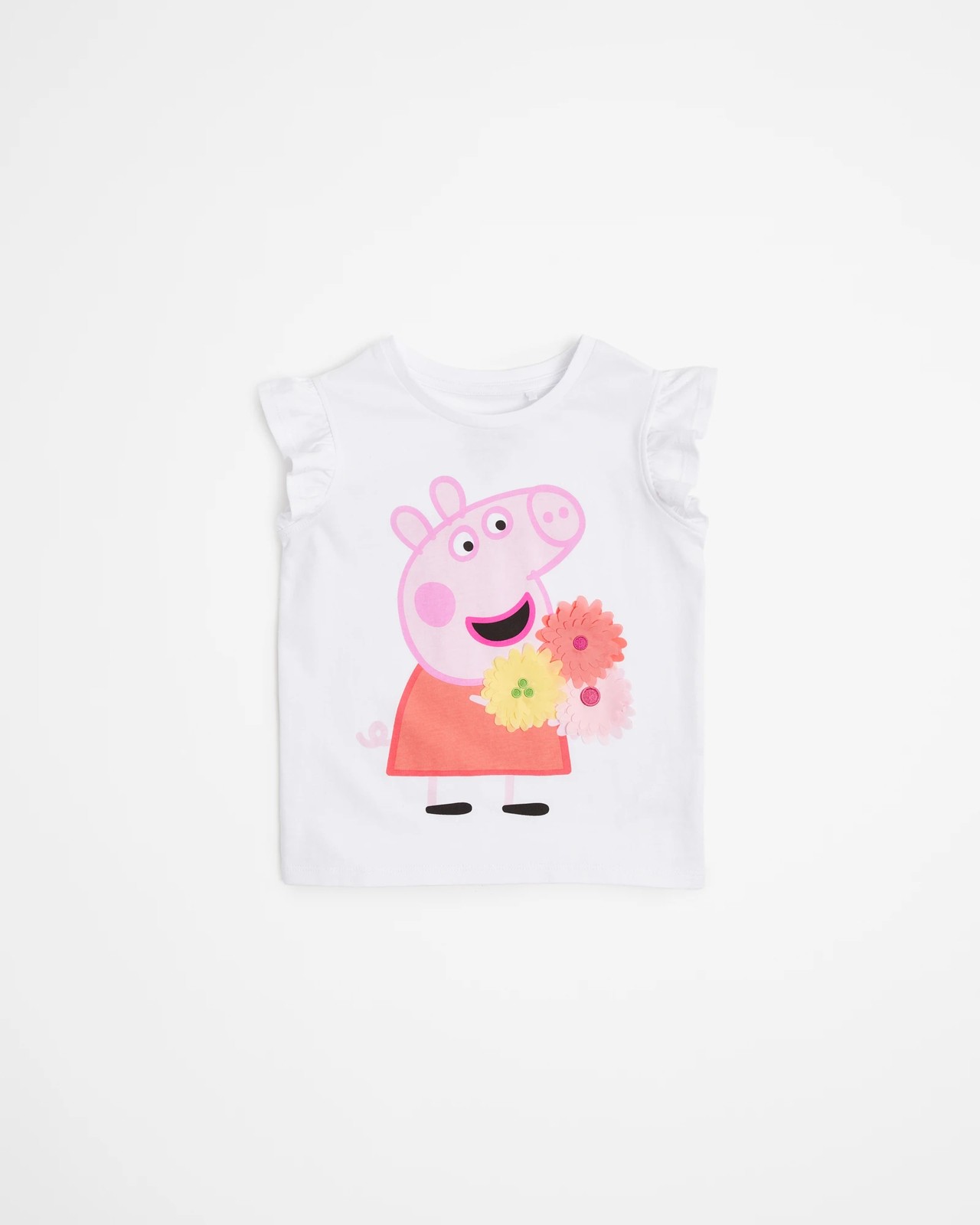 Introducing the adorable Peppa Pig Frill Tank! Made from high-quality cotton fabric, this tank offers a comfortable and regular fit for all-day wear. Featuring a classic crew neck and sleeveless design adorned with frill cuffs, it's perfect for warm weather. The highlight of this tank is the large Peppa Pig print on the front, beautifully embellished with flower applique detailing. With its straight hem and stylish white colour, this tank is a must-have addition to any Peppa Pig fan's wardrobe. Get ready for summer and show off her love for Peppa Pig with this delightful tank. Shop now and fuel your little one's Peppa Pig obsession!