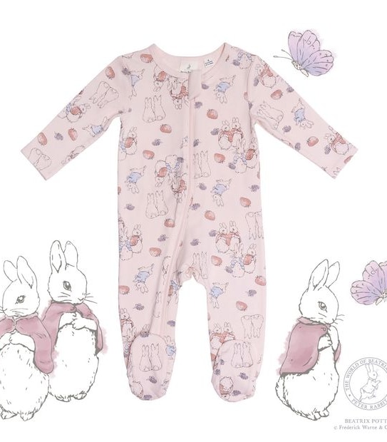 This gorgeous little coverall features a two way heritage yardage print where Peter, Flopsy and Mopsy are hunting for strawberries. Made in a super soft cotton elastane jersey and has a two way zip for ease of dressing and covered footbed your keep your little bunny's toes toasty.