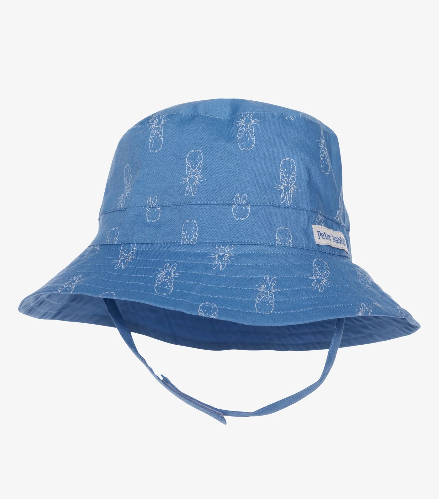 This peter rabbit hat is designed in a soft cotton with an all-over print. The hat is a bucket style with a soft touch fastener strap. Wear with the matching short and shirt set for a cute, coordinated outfit for baby.