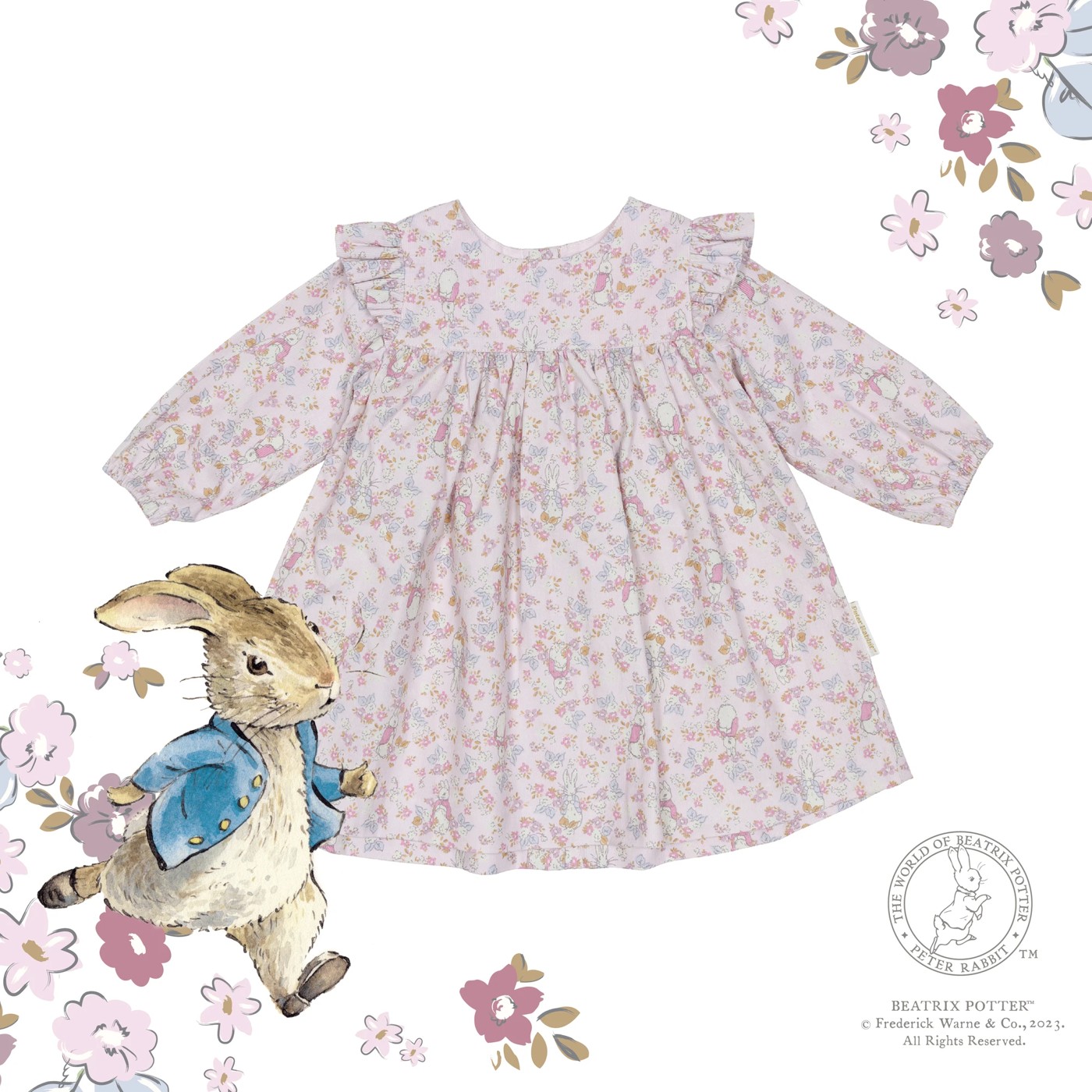 Made in super soft corduroy, this adorable dress features a divine all over floral Peter Rabbit print with ruffle edgeing on the sleeve. Special etched buttons run along the back of the dress and has elasticted cuff openings on the sleeve. Layer this with the Peter Rabbit fur collar coat and your winter outfitting is made for the chilly weather.