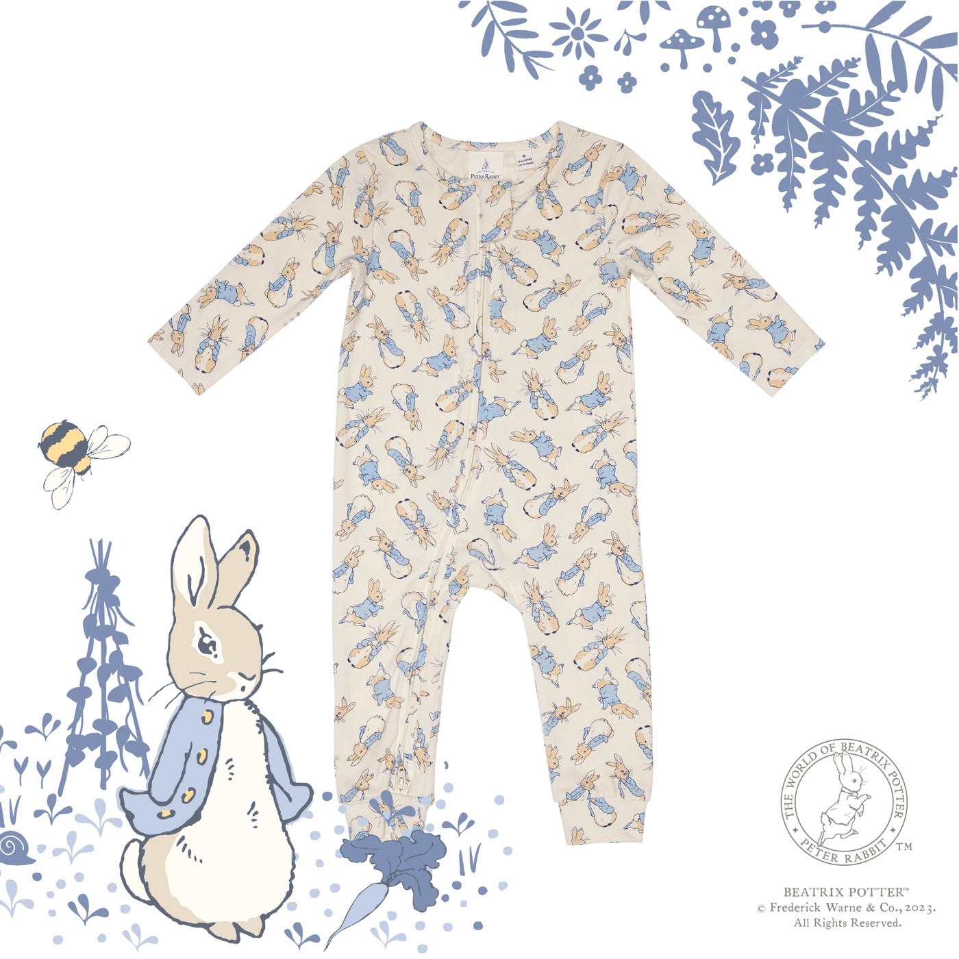 This gorgeous footless coverall features a four way allover Peter Rabbit print. Made in a super soft cotton elastane jersey and has a two way zip for ease of dressing