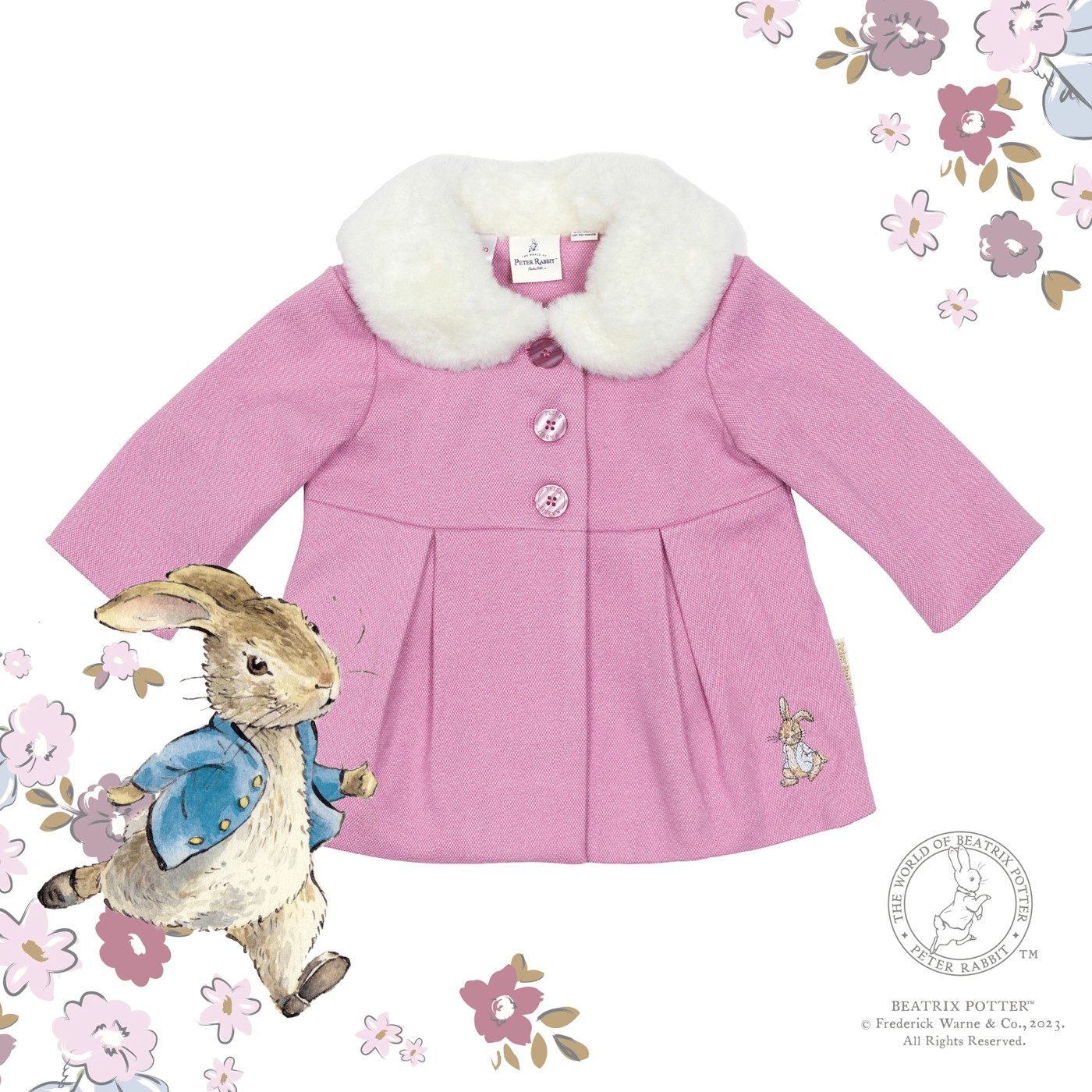 The perfect cold weather item, this special little coat feaures a delightfully soft faux-fur collar and patch pockets with a Peter Rabbit embroidery. Also features special etched buttons, a gold foiled Peter Rabbit pip, this swing coat will go with all your little ones outfits and is perfect all your special occasions and looking cute a button on your park dates.