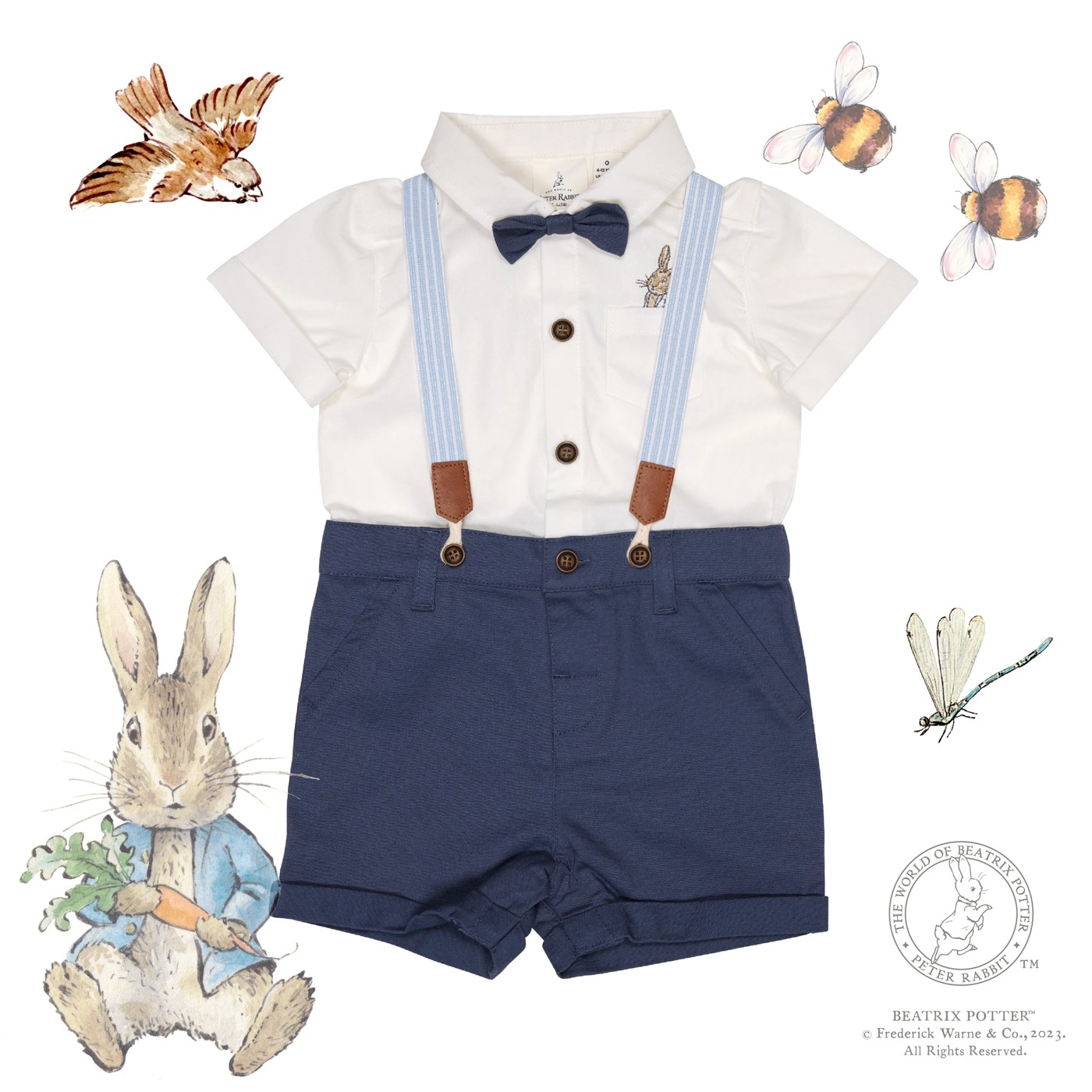 This cute little romper is made from soft cotton elastane jersey and features braces, a bow tie and a little embroidery of Peter Rabbit popping out of the pocket. It has concealed snaps for easy dressing and a Peter Rabbit badge at the back.