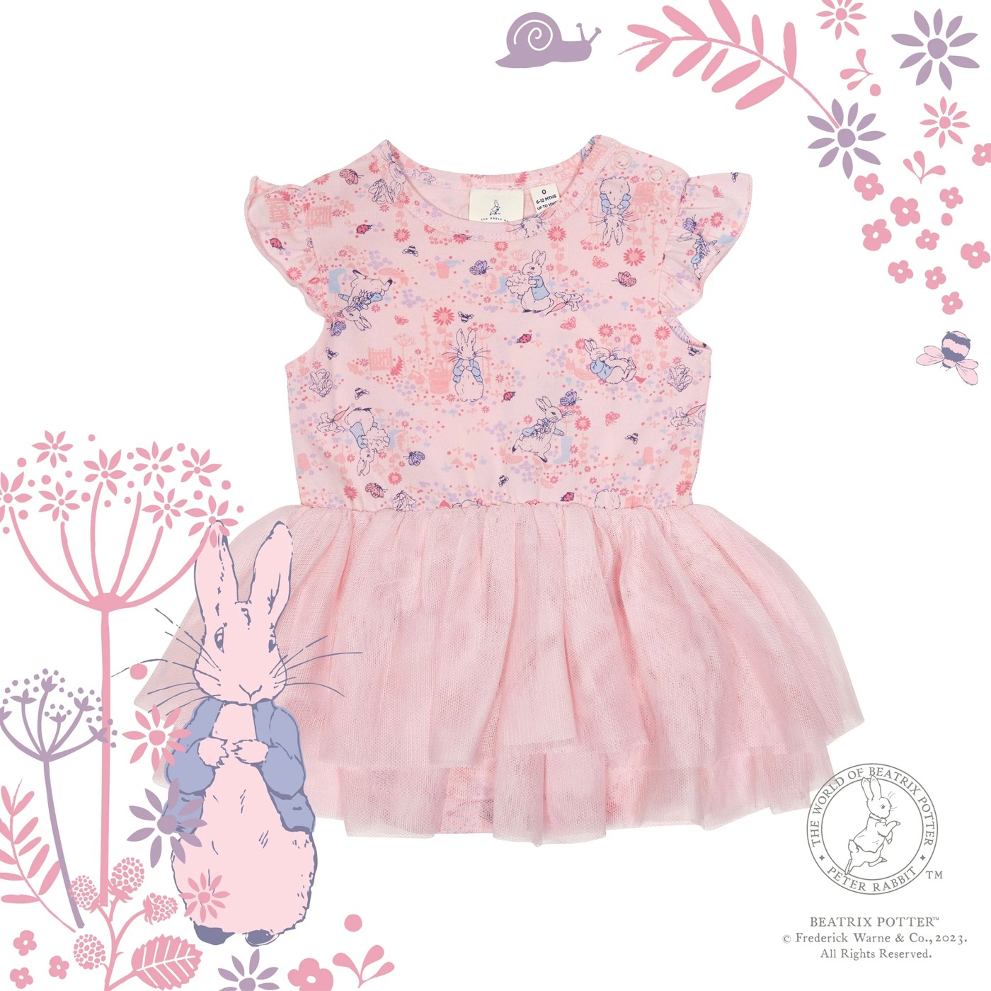 This pretty pink Tutu bodysuit features a two way print featuring Peter Rabbit in the garden with little butterflies and bumblebees. Made in a super soft cotton elastane jersey with shoulder and crotch snaps for easy dressing and a Peter Rabbit badge.