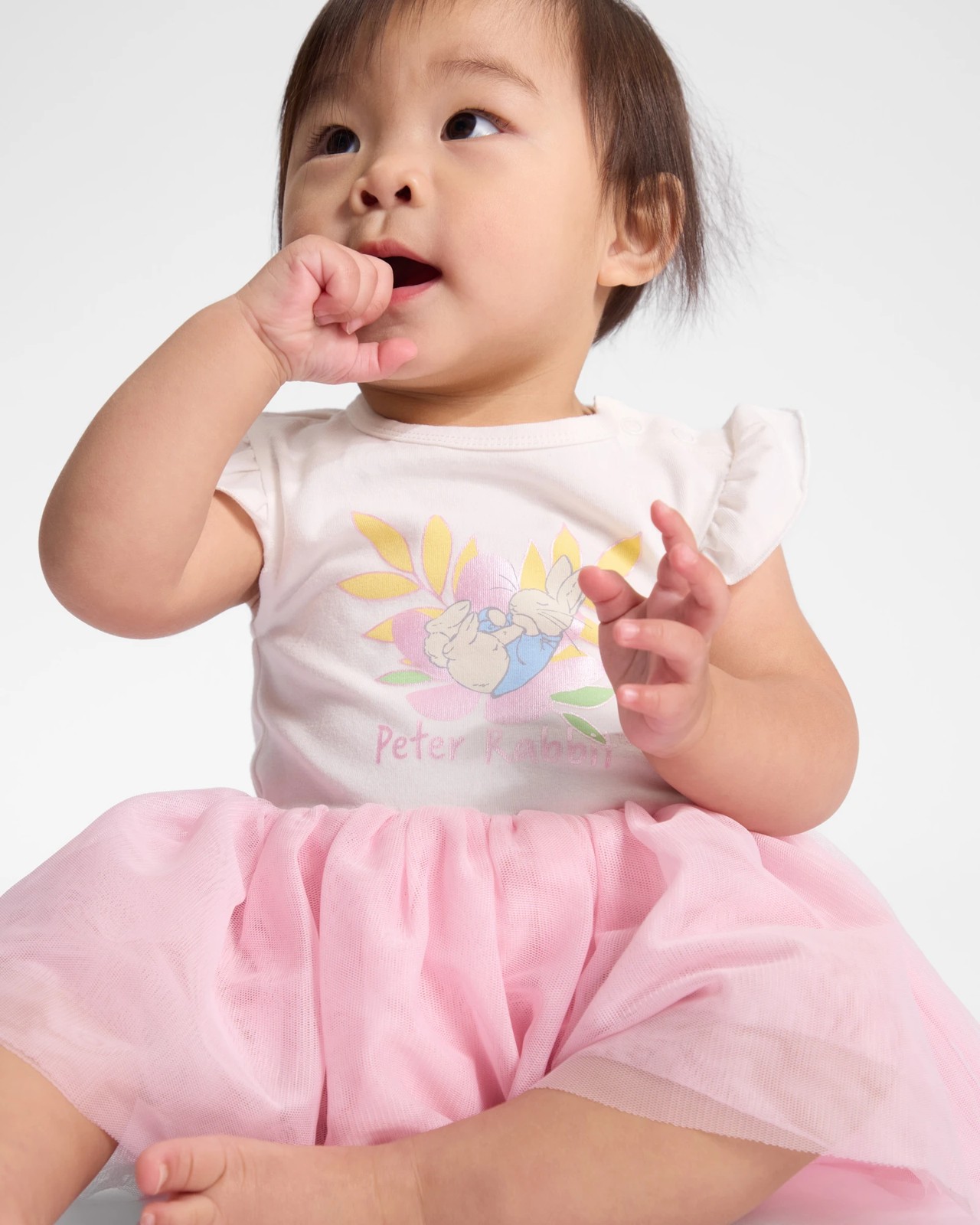 This peter rabbit bodysuit is designed in soft cotton elastane jersey and features a placement print to the chest, the print also has metallic print elements for extra sparkle. The bodysuit has a pink mesh tutu that your little one is sure to love.