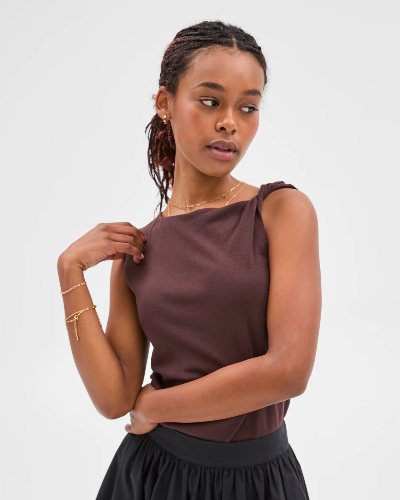 Step out in comfort and style with the Petites Australian Cotton Twist Detail Tank Top. This lightweight top is made from soft Australian cotton, delivering a breathable feel perfect for sunny days. Its delightful twist accent at one shoulder adds a unique charm, while the boat neckline and sleeveless design make it easy to wear from morning to night. The deep chocolate brown colour gives it a rich, inviting look that matches effortlessly with your wardrobe favourites. Enjoy everyday confidence and a cheerful mood with this easygoing tank top, ideal for any casual outing.