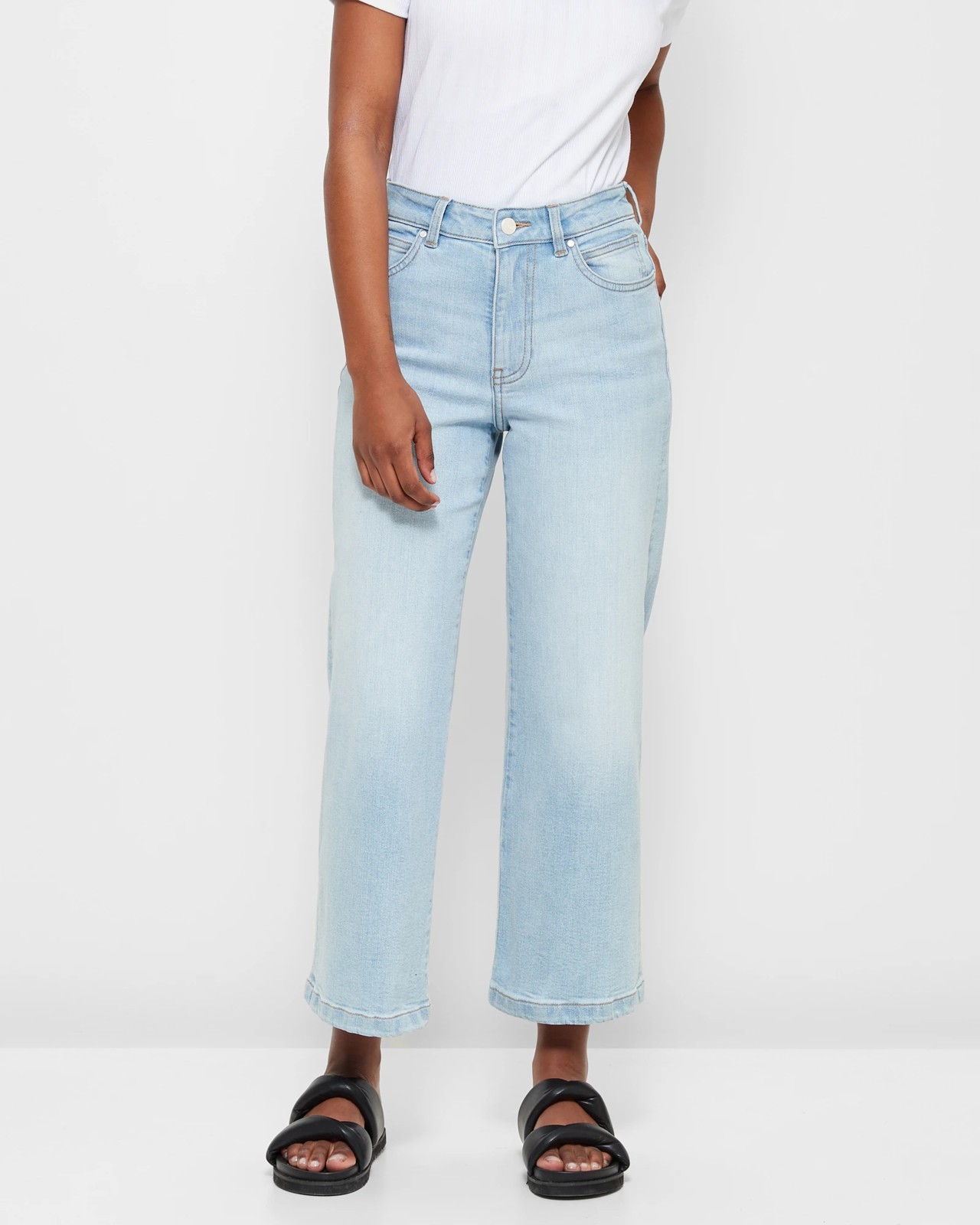 Elevate your denim collection with these Petites Crop Wide Leg Denim Jeans by Dannii Minogue. Crafted from a luxurious cotton-rich fabric with added stretch for supreme comfort, these jeans feature a sky blue wash that adds a pop of colour to your wardrobe. The jeans have a petite fit, ensuring a flattering silhouette for smaller frames. The structured waistband with belt loops provides a secure fit, while the front button and zip closure adds a classic touch. You'll love the wide leg design, which creates a stylish and trendy look. The crop length is perfect for showing off your favourite shoes. Complete with back open spade pockets, these jeans offer both style and functionality. Embrace fashion with these must-have jeans today.