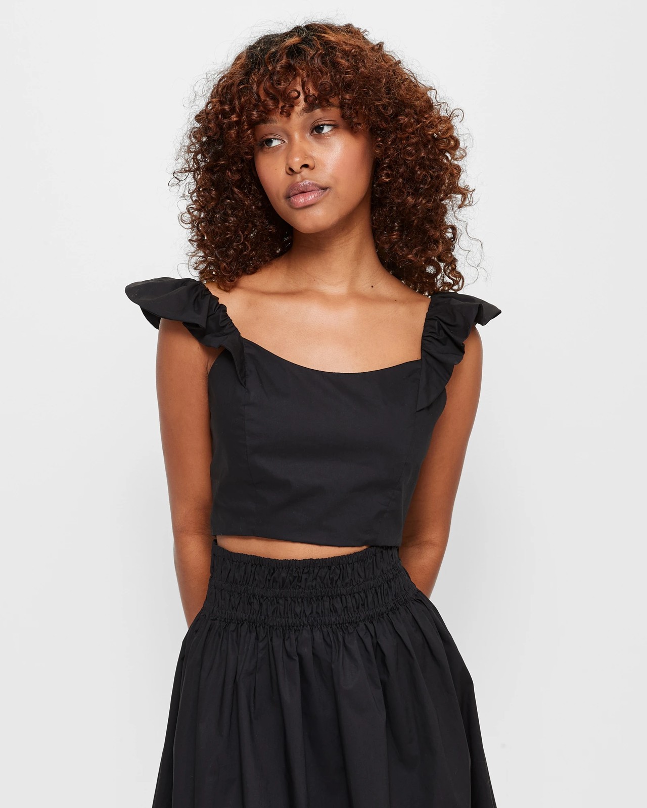 Introducing the Petites Cropped Ruffle Top by Dannii Minogue, a must-have addition to your wardrobe. Made from a high-quality cotton fabrication, this top is not only stylish but also incredibly comfortable to wear. The cotton lining ensures a smooth fit and enhances the overall look.Designed with a petite fit, this black top features a rounded neckline and elastic around the shoulders, providing a flattering and feminine silhouette. The ruffles around the shoulders add a touch of elegance and turn heads wherever you go. The sleeveless design makes it perfect for warm weather or layering during the cooler seasons.The top is panelled throughout, creating a sleek and structured look. The straight hemline gives it a modern and chic appeal. With its cropped length, it is a versatile piece that can be paired with high-waisted trousers, skirts, or jeans for various occasions.For added convenience, it has a side invisible zip closure and a back center shirred elastic panel for easy pull-on. You can effortlessly slip it on and off without any hassle. To complete the look, we recommend pairing it with the matching shirred waist midi skirt (sold separately).Upgrade your style with the Petites Cropped Ruffle Top - Dannii Minogue. Shop now and embrace your fashion-forward side!
