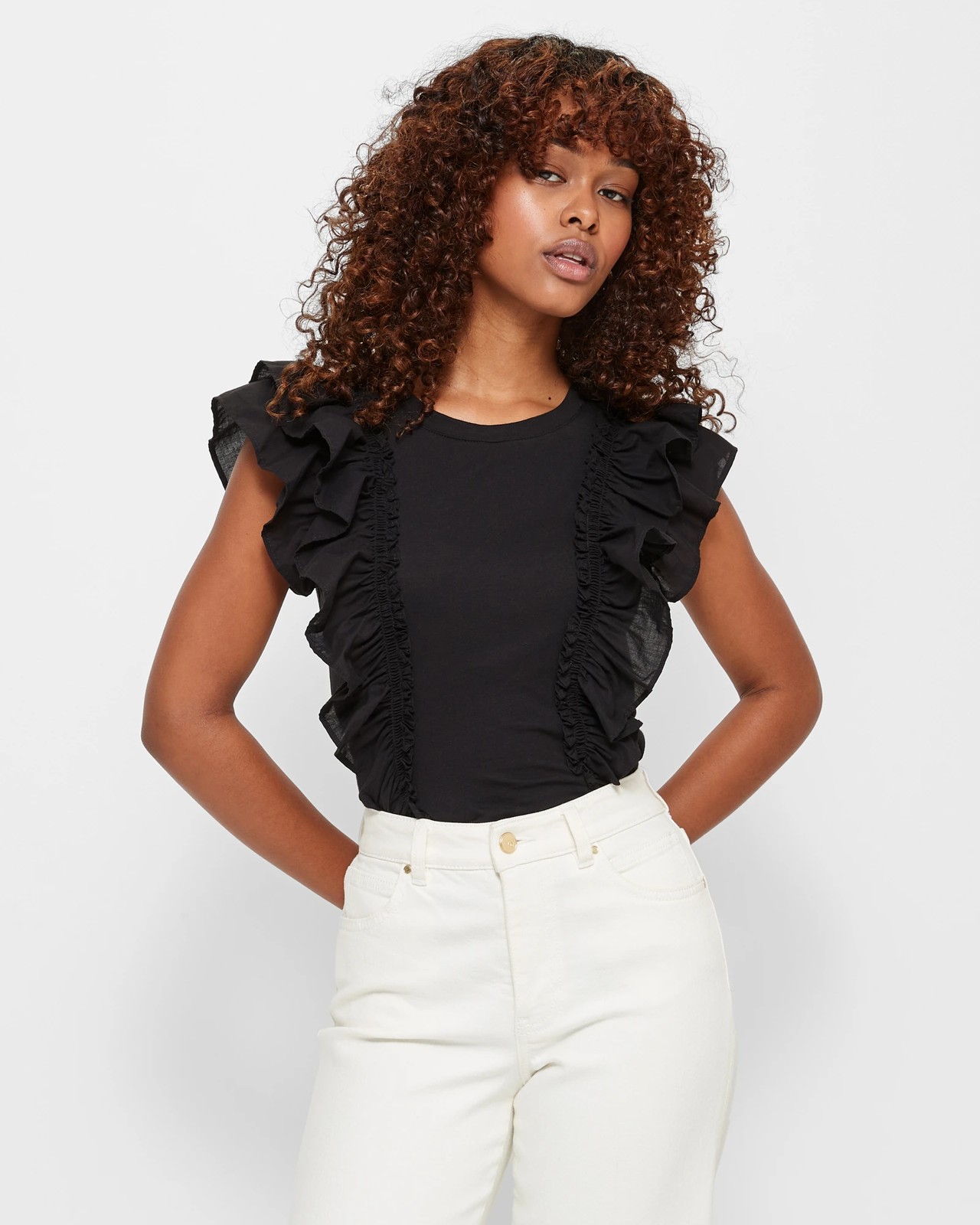 Elevate your style with the Petites Double Frill Top by Dannii Minogue. Crafted from a high-quality cotton fabric, this top is tailored to fit petites perfectly. Its elegant black hue will effortlessly complement any outfit. The crew neckline and frill detail down the front and shoulders add a touch of femininity to the overall design. With delicate frills around the armholes and a sleeveless cut, this top is both chic and comfortable. The straight hemline creates a sleek silhouette. Available in three beautiful colors, this top is a versatile addition to your wardrobe. Embrace your personal style with the Petites Double Frill Top and enjoy the confidence it brings. Take advantage of this must-have piece today and make a statement wherever you go.