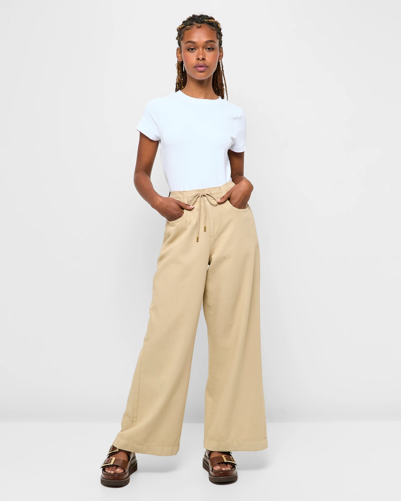 Structured front waistband with belt loops and drawstring