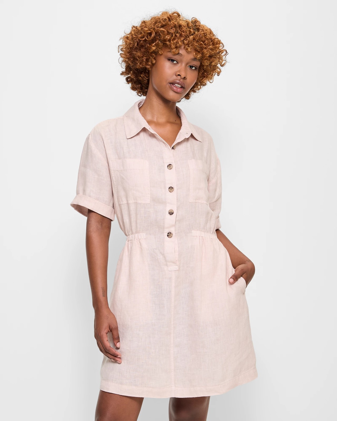 Discover timeless style with our Petites European Linen Mini Dress. Made from high-quality European linen, this dress is both lightweight and breathable, making it perfect for warm days. Featuring a button-down front, it is designed to flatter a petite frame with its round collar neckline and elastic waist sides. This mini length dress with short roll cuff sleeves and open chest pockets will quickly become your favourite for casual and semi-formal occasions. Refresh your wardrobe with this versatile piece!