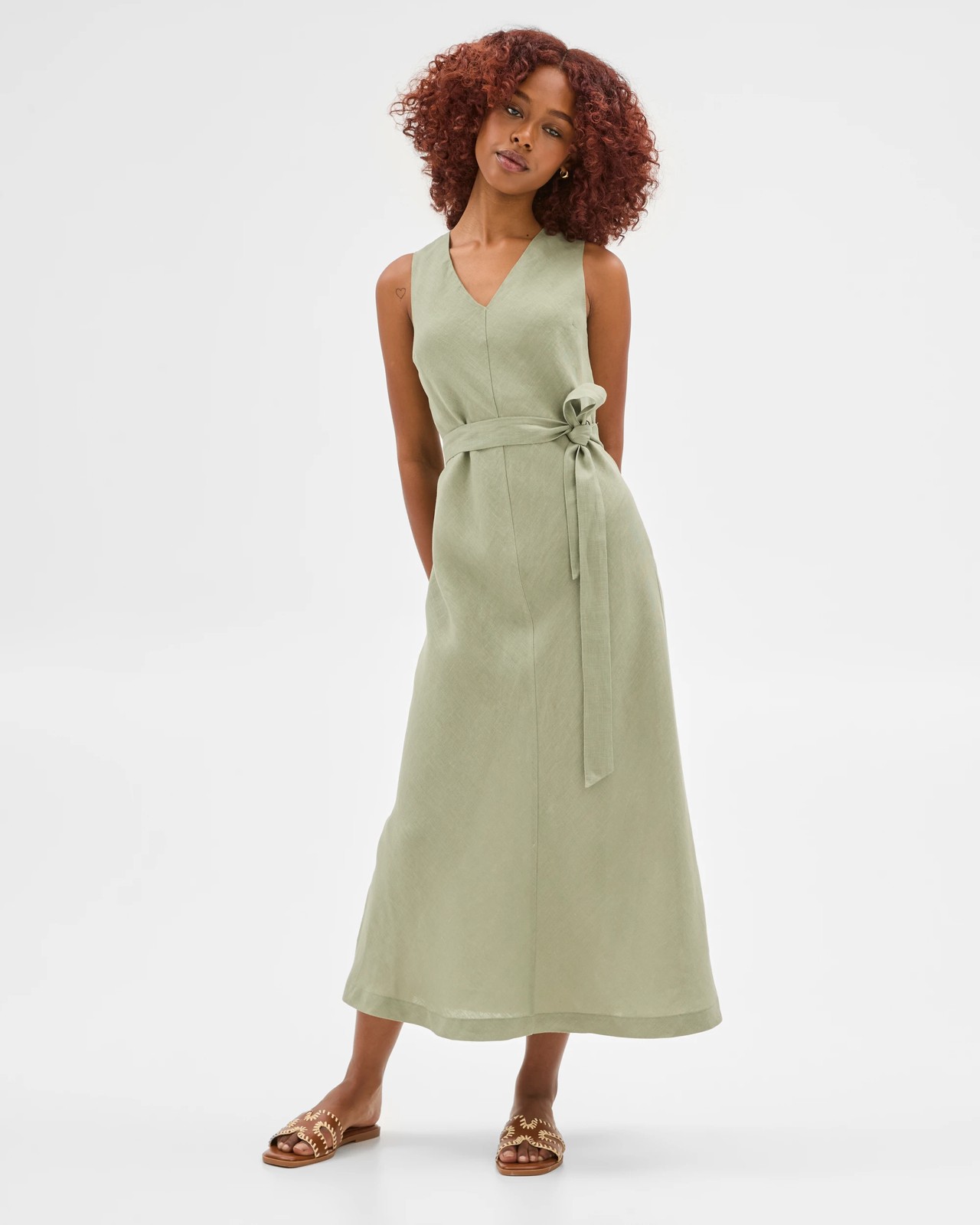 Step out in style with the Petites European Linen V-Neck Midi Dress. This dress is designed to feel light and comfortable on warm days, thanks to its breezy linen material. The flattering v-neckline and elegant midi length offer a classic look that suits everything from casual brunches to special occasions. The removable tie waist lets you shape your silhouette just the way you like, while the sleeveless cut keeps things relaxed and fresh. Embrace effortless charm and make this dress your new everyday favourite.