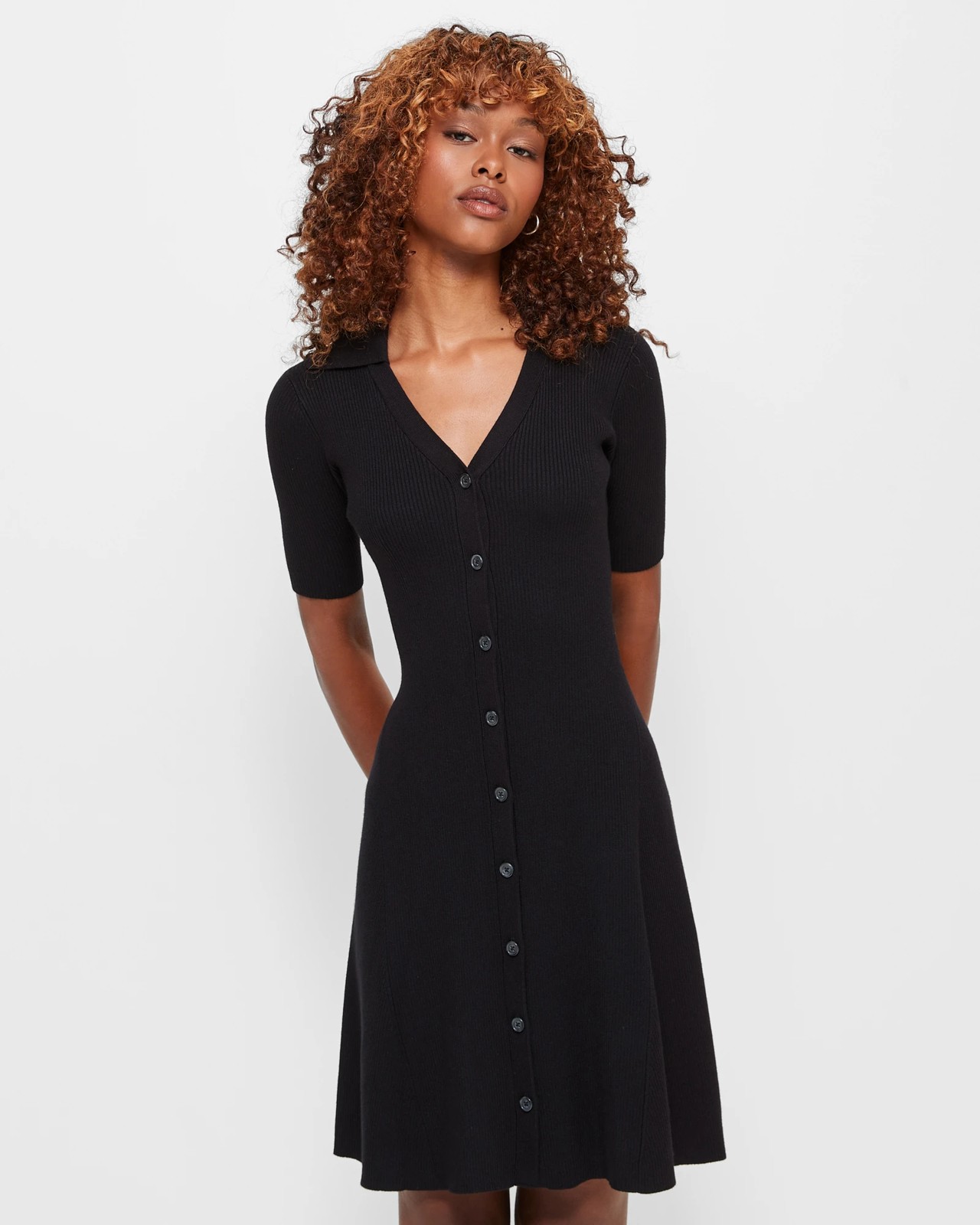 Introducing the Petites Knit Mini Dress by Dannii Minogue, a stylish and comfortable dress that's perfect for any occasion. Made from a luxurious blend of viscose and nylon, this dress features an all-over ribbed knit design that adds a touch of texture and sophistication. With its petite fit and round collared neckline with a v-drop front, this dress is designed to flatter your figure and enhance your natural beauty. The short sleeves and button-through front add a playful and feminine touch. The A-line cut skirt and straight hemline create a flattering silhouette, while the midi length adds a touch of elegance. Don't miss out on this must-have dress. Shop now and experience the perfect blend of style and comfort.