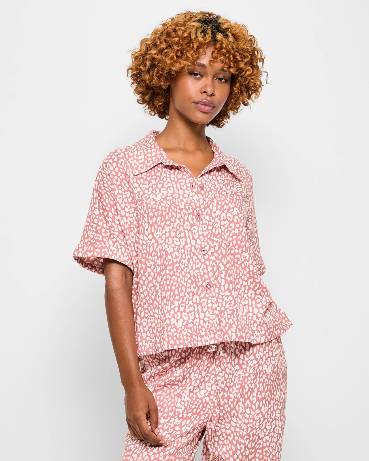 Discover the charm of our Petites Linen Blend Shirt that combines viscose, cotton, and linen for a soft and airy feel. With its regular fit and playful leopard print, this shirt offers a casual yet fashionable look. The round collar and buttoned front provide a classic touch, while the short roll-cuff sleeves and open chest pocket add a hint of modernity. Perfectly sized for petites, this versatile shirt is ideal for warm days and can be easily paired with matching trousers to create a complete outfit. Don't miss out on this comfy and stylish addition to your wardrobe!