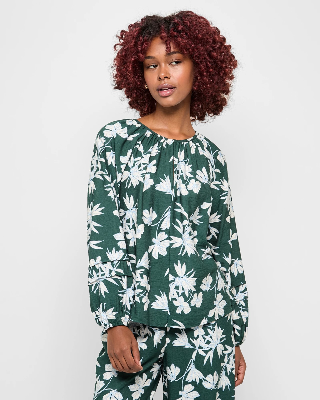 Discover the allure of our Petites Long Sleeve Blouson Blouse, created from a gentle viscose and nylon mix. This airy blouse flows gracefully, featuring a lovely green floral design. The round neckline with subtle gathers adds a hint of sophistication, while the long blouson sleeves with pleated detailing lend a charming touch. Ideal for any outing, this blouse is both fashionable and comfortable. Enhance your collection with this must-have piece today!