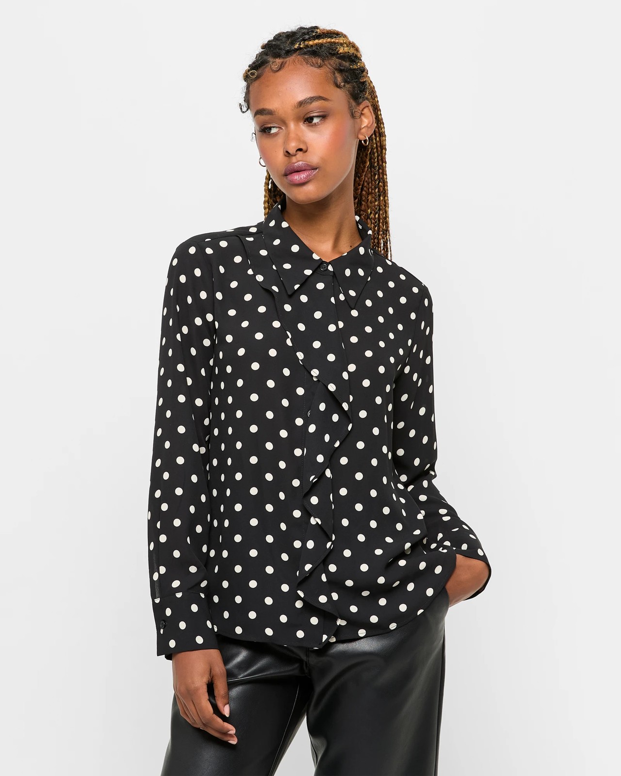 Unveil your sophisticated side with our Petites Long Sleeve Ruffle Front Blouse. Made from soft polyester, this blouse ensures a comfortable fit that flatters your figure. The stylish black and white spot print combined with its ruffled front and button cuff sleeves adds a touch of timeless charm. Perfect for various occasions, this piece adds a delightful twist to your wardrobe. Don't miss out on updating your style with this versatile blouse.