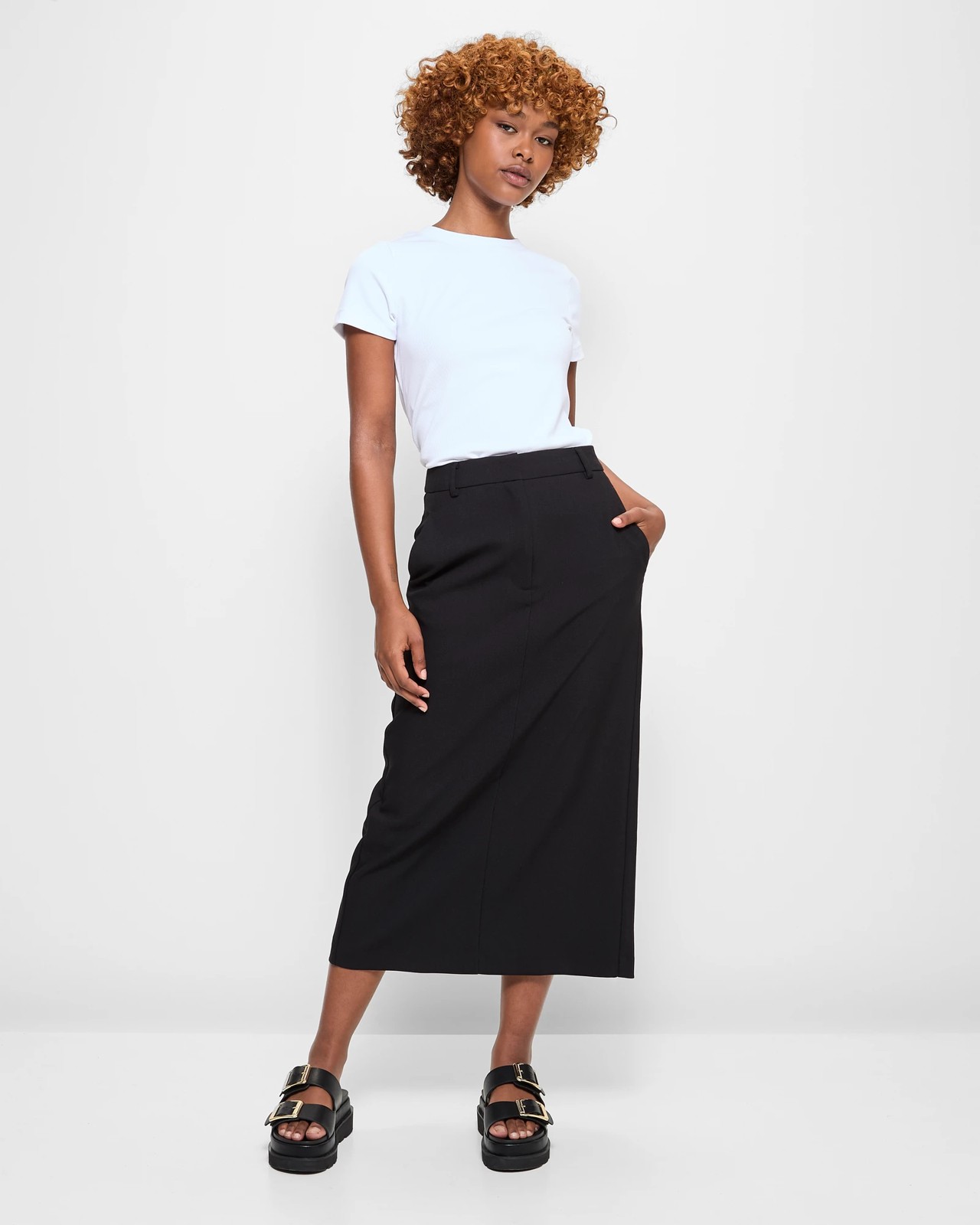 Introducing our Petites Midi Column Skirt, made from a fine blend of polyester and viscose with added stretch elastane for optimal comfort. The inner lining and tailored cut provide a secure and comfortable fit. Featuring a structured waistband with belt loops and practical side pockets, this skirt combines functionality and style. The front clasp and zip, accompanied by an inner button, offer reliable closure. This straight-cut, midi-length skirt with a back centre split ensures ease of movement. Perfect for both formal and casual settings, it is a versatile addition to any wardrobe.