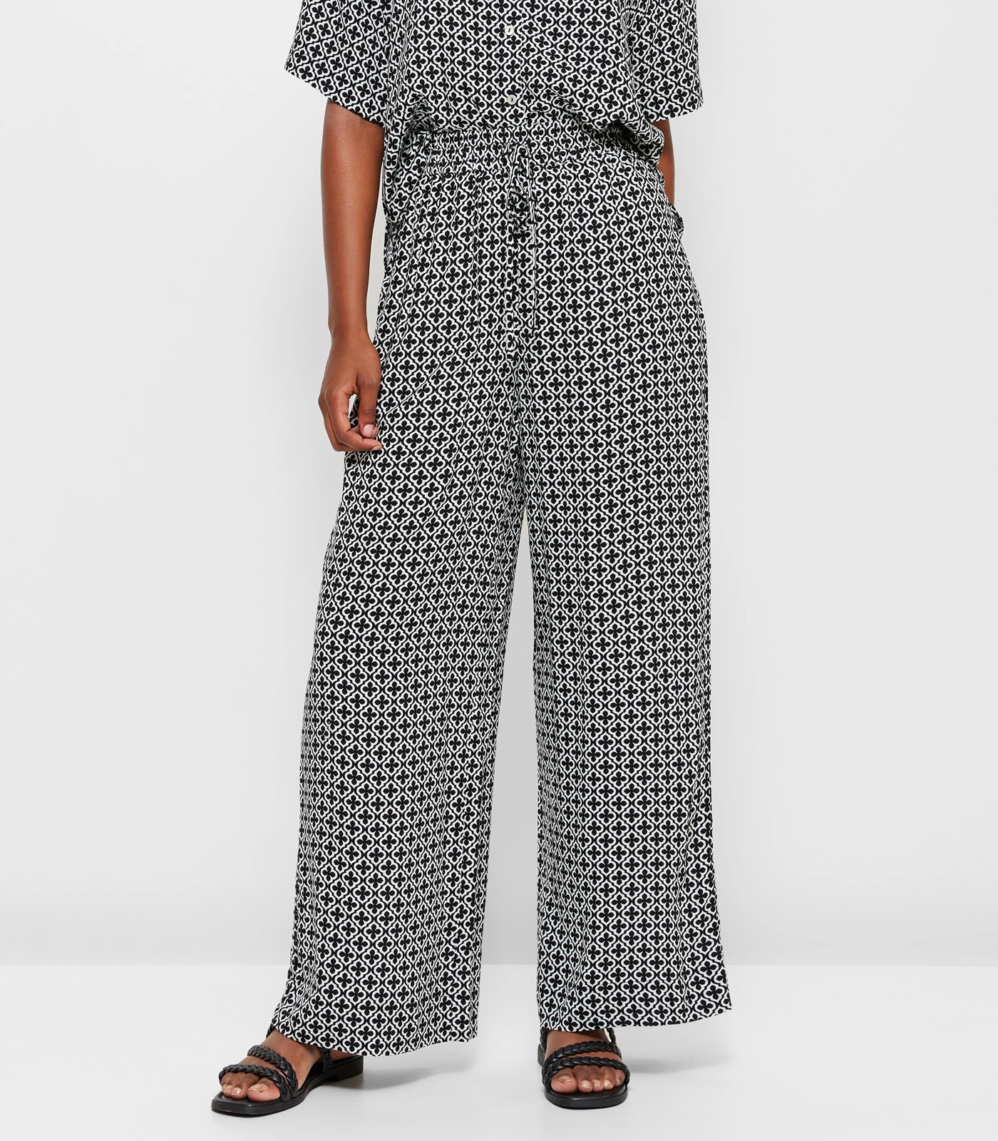 Upgrade your wardrobe with these stunning Petites Print Wide Leg Pants designed by Dannii Minogue. Made from a lightweight and comfortable viscose fabrication, these pants are perfect for everyday wear. The black and white all-over geo print adds a touch of sophistication to any outfit. The pants feature a thick elastic waistband with a drawstring for a secure and adjustable fit. With side seam pockets, you can easily carry your essentials wherever you go. The wide leg design and ancle length create a flattering silhouette that suits all body shapes. Complete your look with a stylish top and heels for a chic and fashionable ensemble. Don't miss out on these must-have pants! Get yours now and elevate your style.