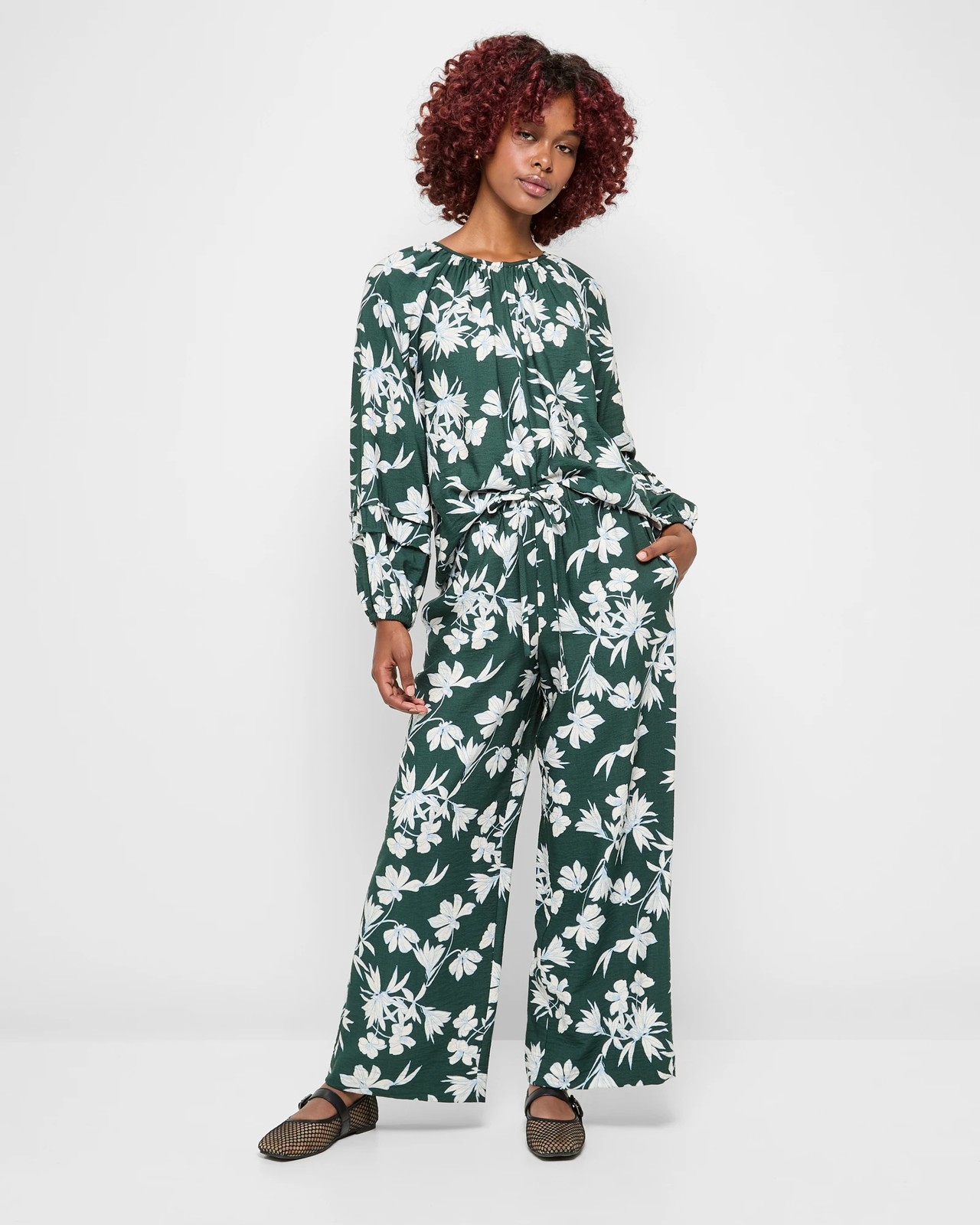 Our Petites Print Wide Leg Pants bring a blend of style and comfort, created from a soft viscose and nylon mix. These light trousers offer a natural fit, perfect for adding a touch of charm to your wardrobe. The green full-length pants feature a distinctive all-over floral stencil design, with an elastic waistband and drawstring for added ease. Practical side seam pockets and a wide leg cut make them an ideal choice for any setting. Refresh your basics with these versatile and chic trousers.