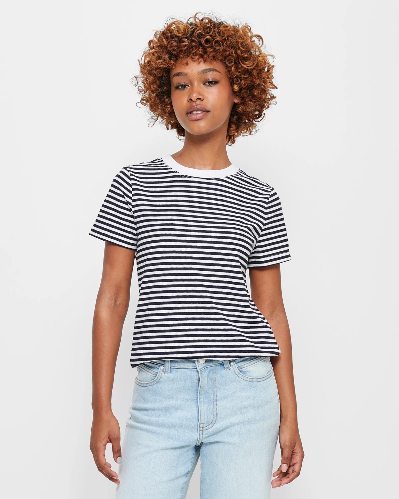 Elevate your everyday look with the Petites Rib T-Shirt by Dannii Minogue. Crafted from a blend of polyester and viscose, this tee offers the perfect combination of style and comfort. Its stretchy fabric ensures a flexible fit that moves with you all day long. Made with recycled materials, this top also boasts an all-over ribbed design for a trendy touch. Complete with a crew neckline, short sleeves, and a straight hemline, this petite fit tee is a must-have staple. Show off your sophisticated style with the DM medallion detail on the back of the neck.