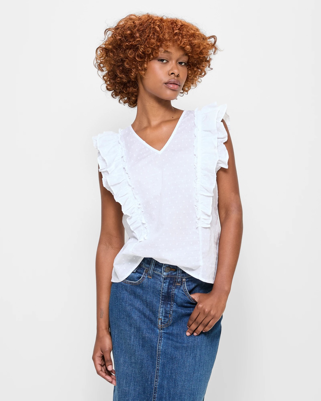 Unveil an effortlessly stylish look with the Petites Ruffle Detail V-Neck Top by Dannii Minogue. This charming top is made from a lightweight cotton fabric that ensures you stay cool and comfortable. Featuring delicate dobby dots, a v-neckline, and playful ruffle details, it’s perfect for adding a feminine touch to your outfit. Specially designed for petite figures, this top fits perfectly and pairs wonderfully with your favourite trousers or skirts. Don't miss the chance to make this versatile addition to your wardrobe!