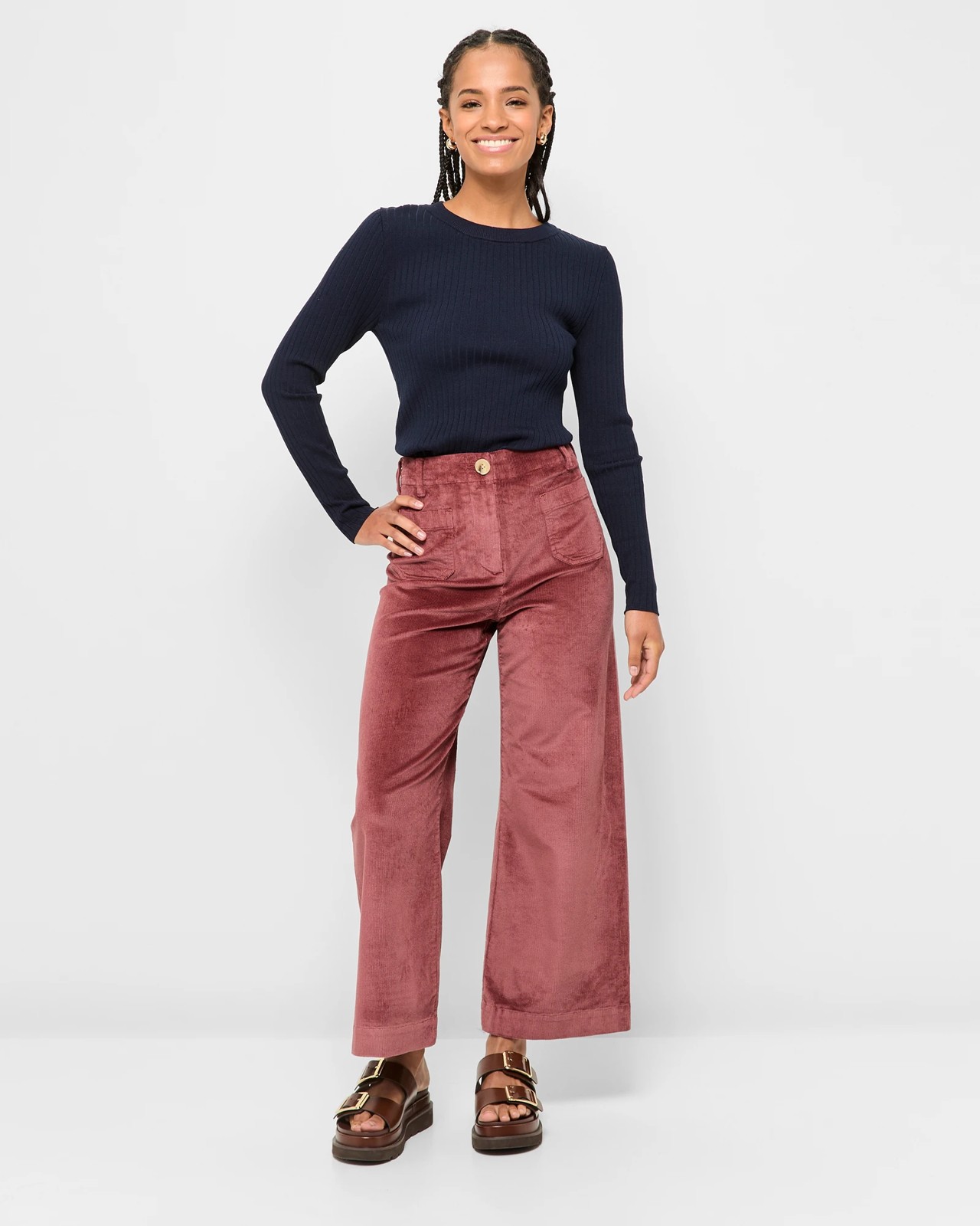 Transform your style with these Petites Stretch Wide Leg Cropped Cord Pants, perfect for combining comfort with a touch of classic charm. These women's pants are made from a cotton/modal blend that includes elastane for a comfortable stretch. The all-over corduroy finish adds a vintage feel, while the wide-leg cut and mid-rise waist offer a modern twist. Featuring a secure button and zip fly closure, patch pockets, and a structured waistband with belt loops, these trousers are both functional and stylish. Dress them up or down to suit any occasion.