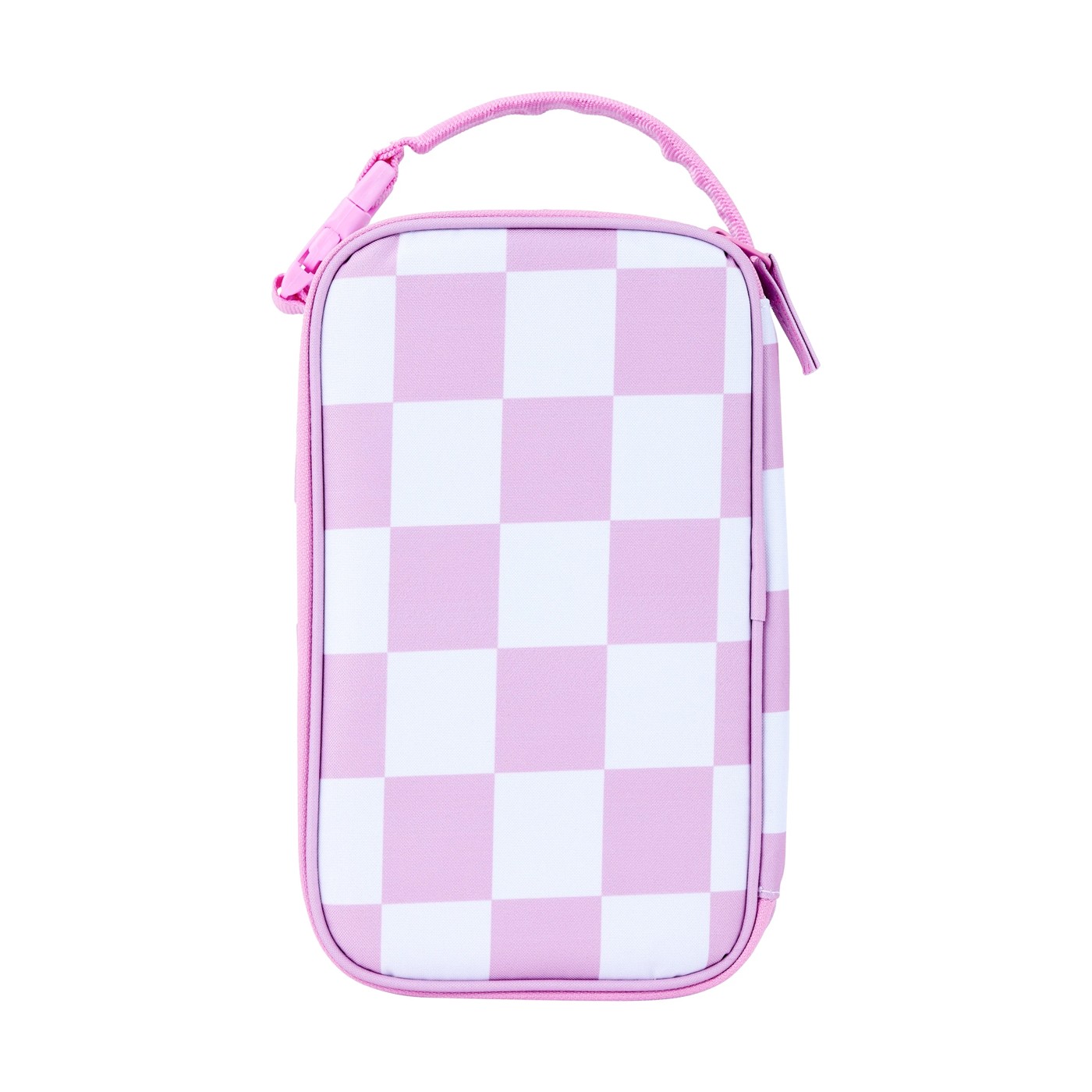 Add a touch of charm to your lunchtime routine with this delightful pink check insulated cold box. Perfect for keeping your food at the right temperature, whether you're heading to school, enjoying a picnic, or spending the day out and about. The secure zip and buckle closure keep everything neatly contained, while the top handle makes carrying easy and convenient. The playful checked pattern brings a cheerful feel to your outings, turning everyday meals into something more enjoyable. With its easy-to-clean lining and practical size, this cold box makes packing and carrying your meals simple and fuss-free. Make every lunch or snack on the go a pleasure—bring this friendly lunch companion along!