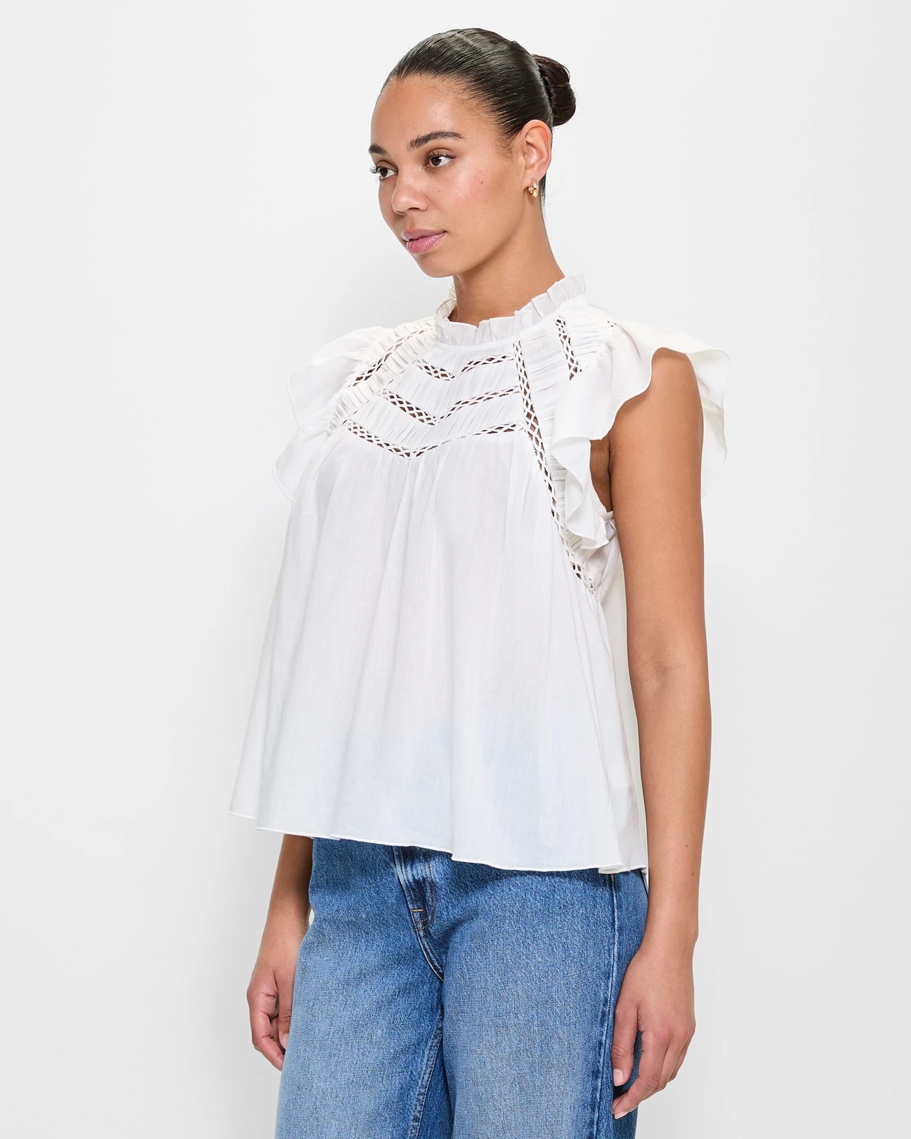 Enhance your wardrobe with our Pintuck Frill Sleeve Blouse, ideal for every occasion. Made from soft cotton, this blouse ensures a light and breathable feel throughout your day. The delightful round frilled neckline and short frilled sleeves add a touch sophistication, while the pintuck and cross lace detail provide a subtle yet stylish accent. With its graceful shape and straight hemline, it offers a fit that compliments your figure and moves with you. Easy to wear with a back button closure and keyhole design, this blouse is a charming addition to your collection. Treat yourself to a blend style and comfort today!