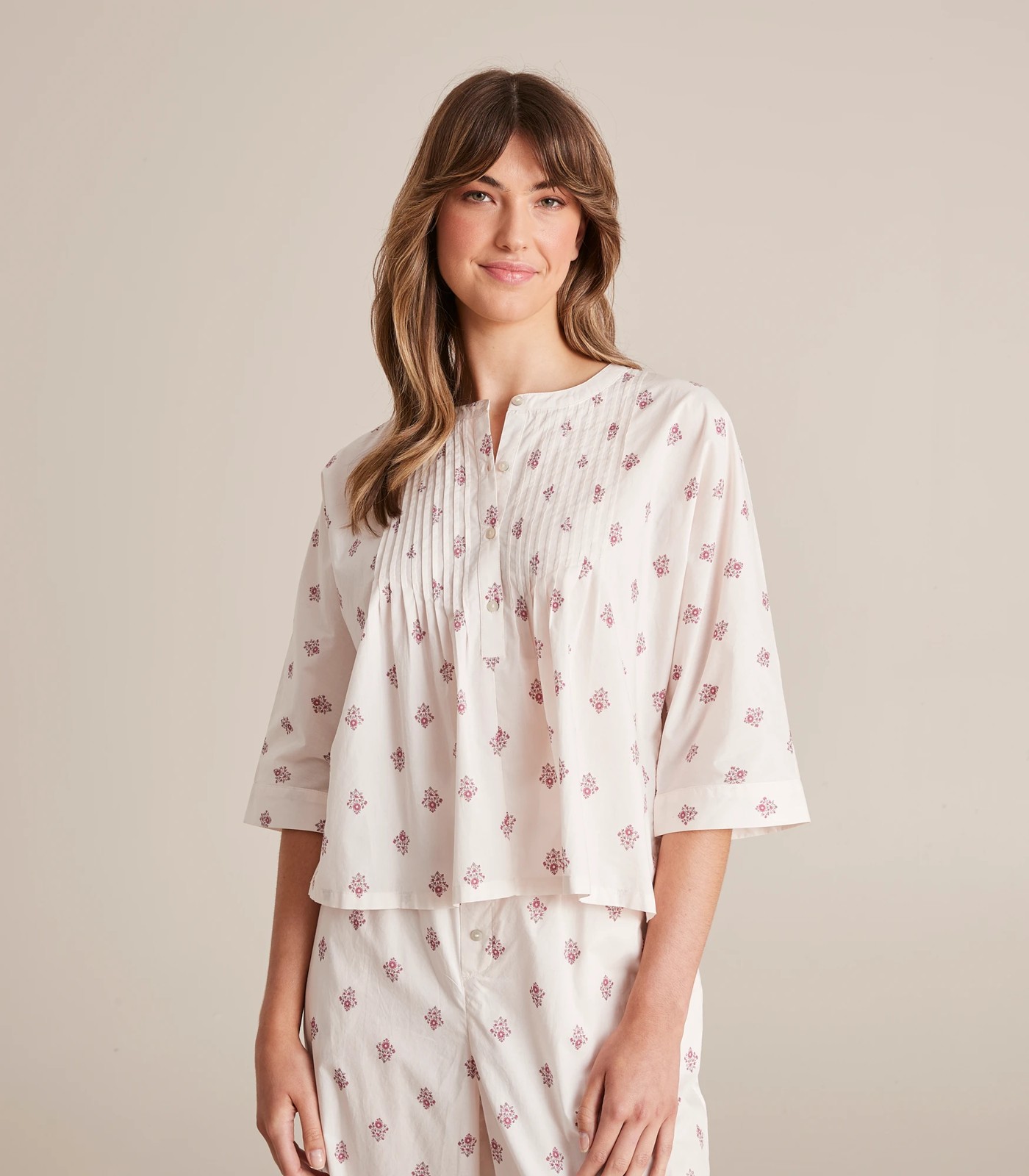 For a great nights sleep in the warmer months, the pintuck sleep shirt is made from a lightweight cotton material, has pintuck pleating detail down the front, short sleeves and a button down front for easy pull on. Pair with the matching bottoms to complete the set (sold separately).