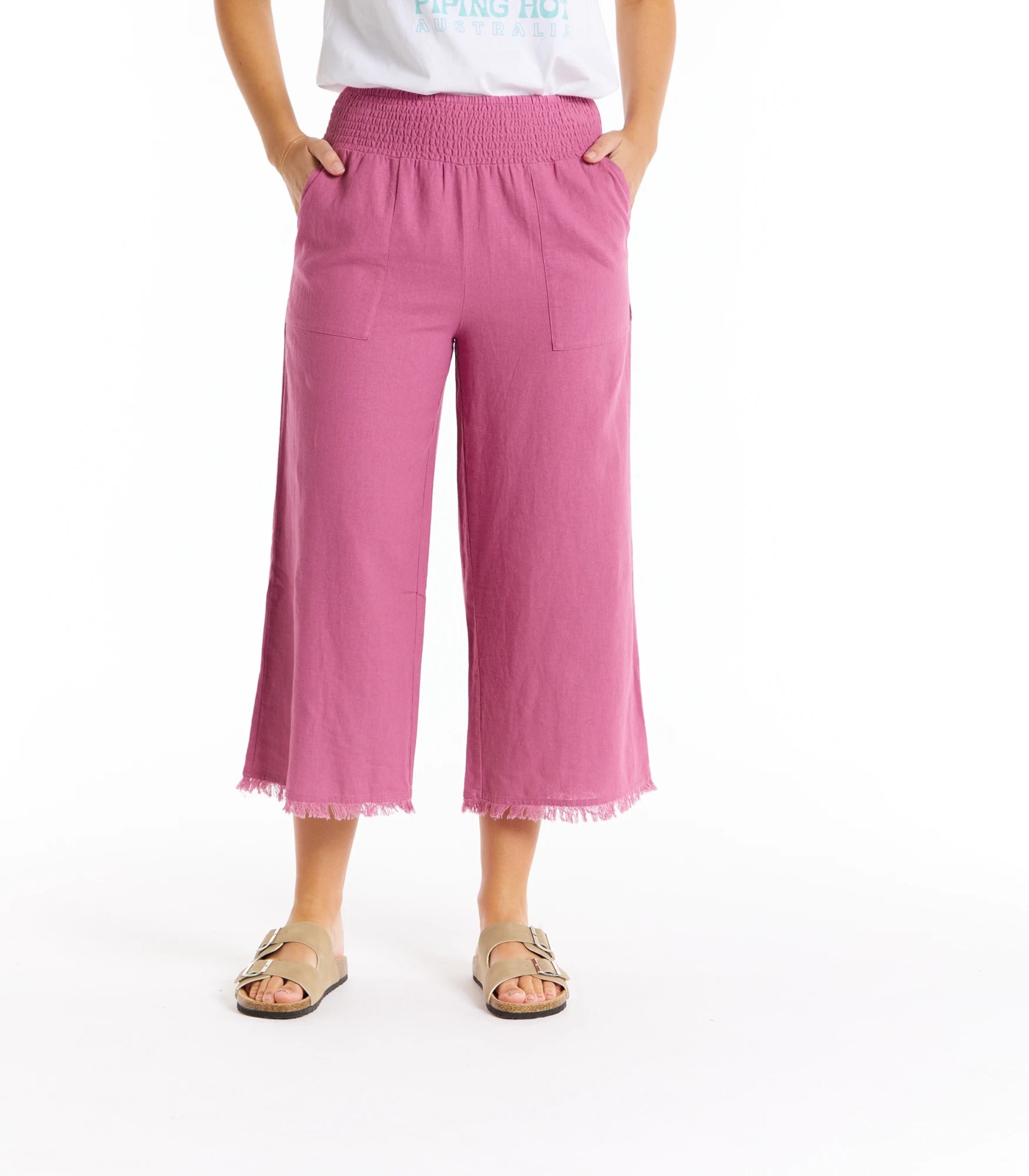 Indulge in a relaxed and laid-back vibe with our stylish Piping Hot linen beach pants. Crafted from a lightweight and breathable fabric, these wide leg pants provide the perfect combination of comfort and style. The pull-on design adds ease to your everyday routine, while the sophisticated mauve colourway adds a touch of elegance. Embrace effortless style and upgrade your beach look now!