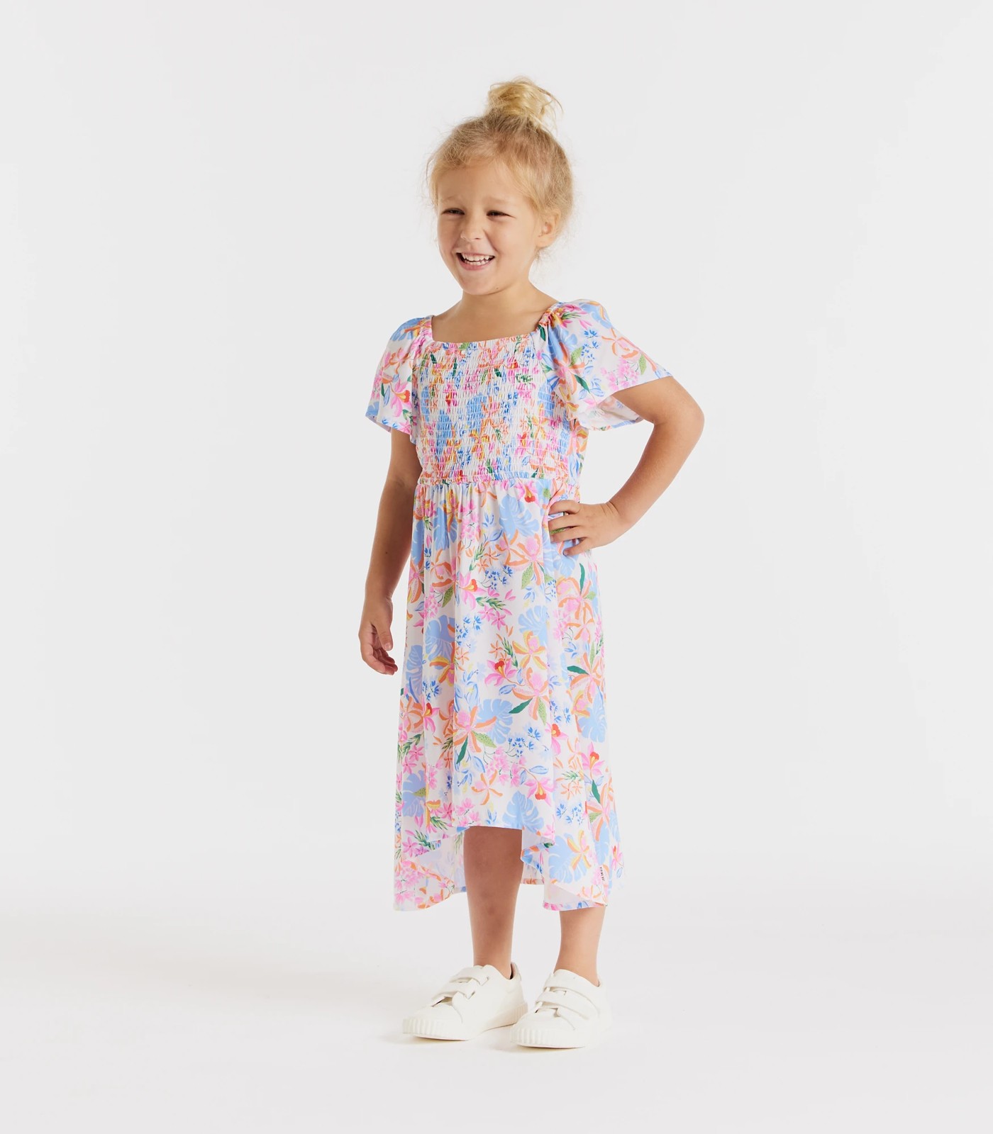 This beautiful Piping Hot Floral Dress is sure to be a showstopper. Crafted from soft viscose, this dress features a regular fit with pull on style for easy wear. The pink floral pattern is accentuated by flutter sleeves and elastic shirred bodice. The high-low hem adds extra charm to this stunning piece, making it perfect for any special occasion. Girls will love how comfortable and stylish this dress is!