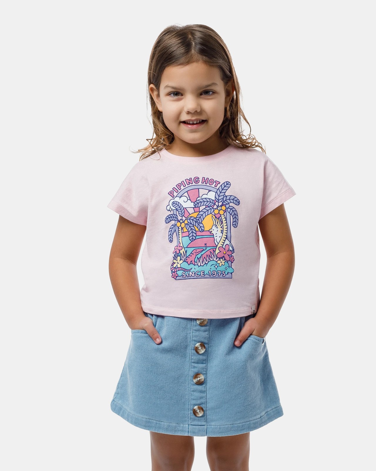 Designed for beach-loving girls for outdoor and indoor play, is this fun graphic T-shirt from Piping Hot in pastel tones. Pair with Piping Hot skirts or shorts.
