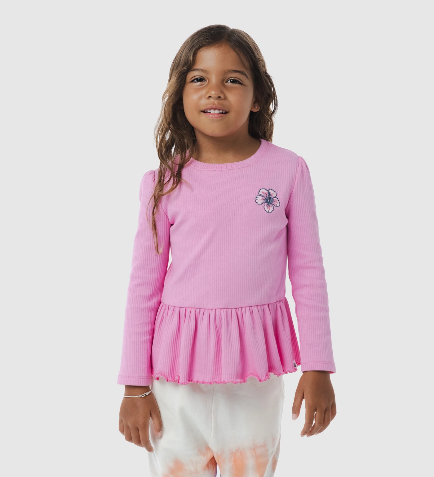 Add a touch of effortless charm to your little one's wardrobe with the Piping Hot Rib Frill Hem Top. This adorable top features delicate floral embroidery at the chest and a stylish frill peplum detail. The soft pink colourway complements any outfit, making it a versatile piece for everyday wear. Whether it's a day out with friends or a family gathering, this top exudes casual elegance and comfort. Embrace the sweetness of childhood with this lovely addition to your child's collection.
