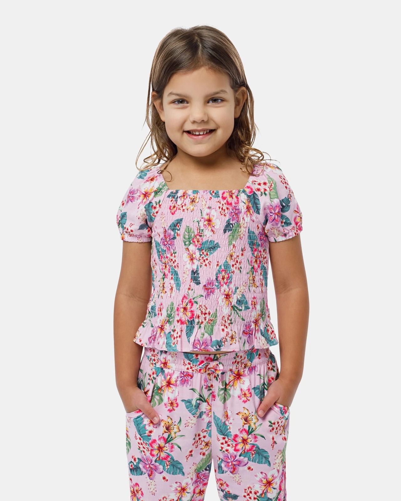She'll love this pretty pink Piping Hot blouse top in soft viscose for easy wear. With shirred body for comfort and relaxed styling all day and everyday. Wear with the matching pant for cool set dressing.
