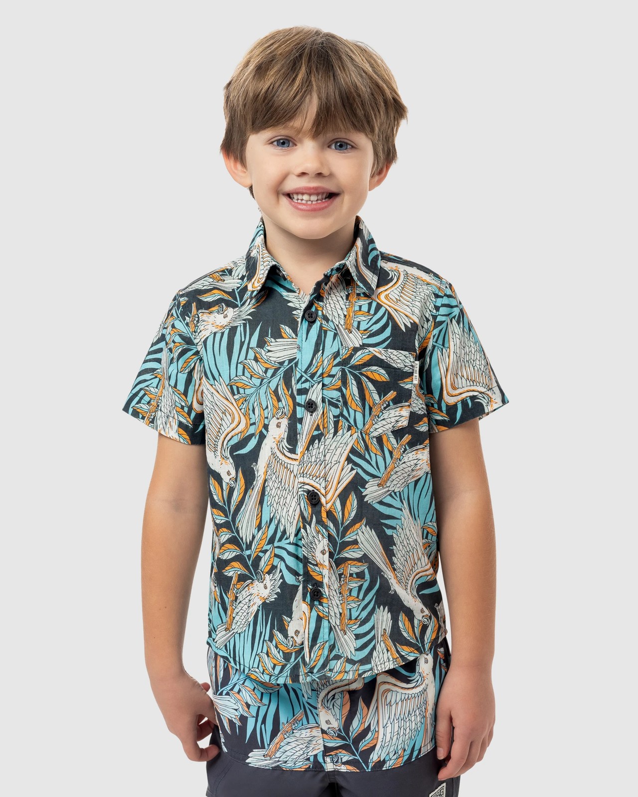 Designed for playful and spirited boys, is this printed shirt from Piping Hot featuring a bird and palm print. Pair with Piping Hot beach volleys or cotton jersey shorts.