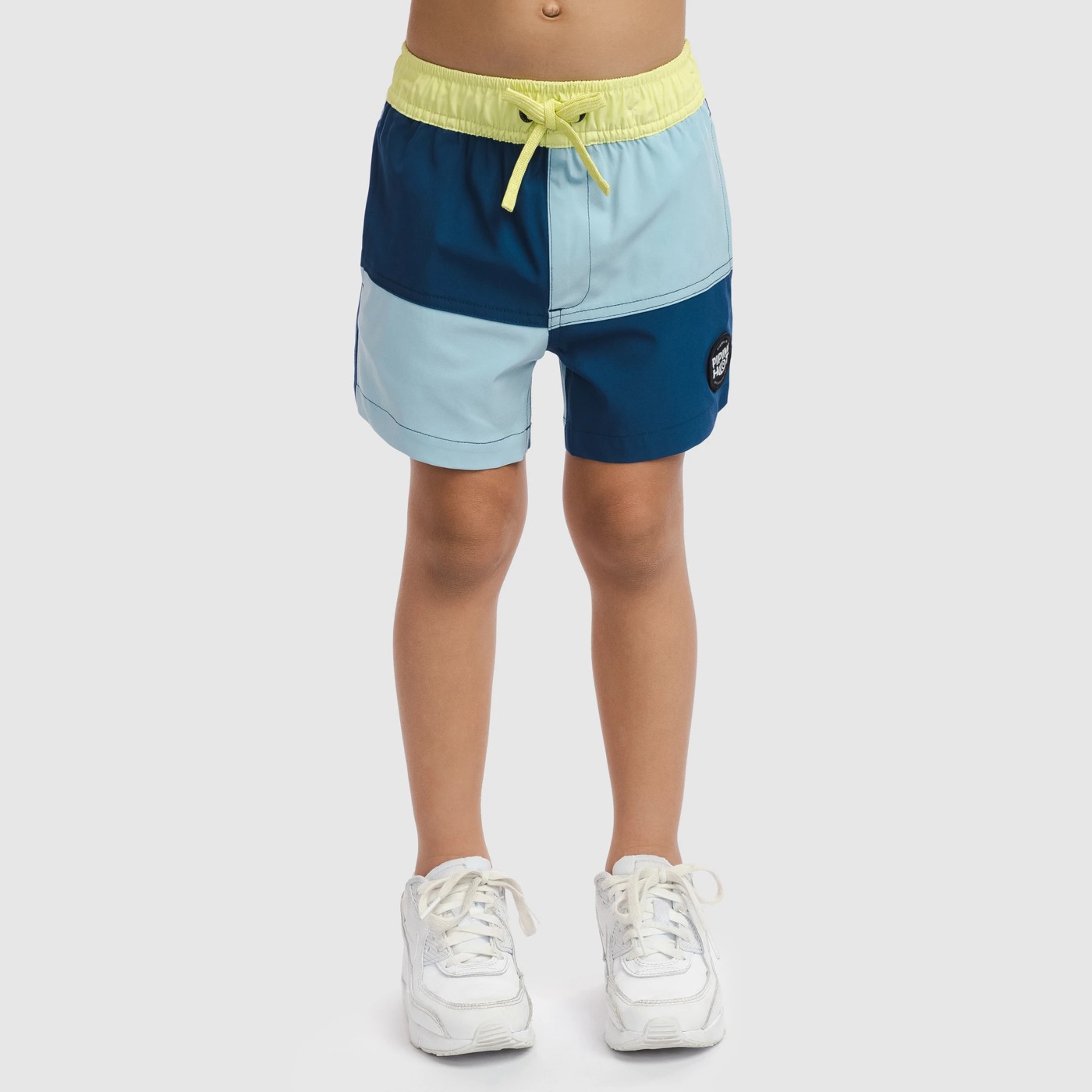 Easy wear volleyshorts for the pool, the beach and play featuring blue panelling and a fun yellow waistband. Made with recycled polyester as part of Piping Hot's commitment to ocean protection.