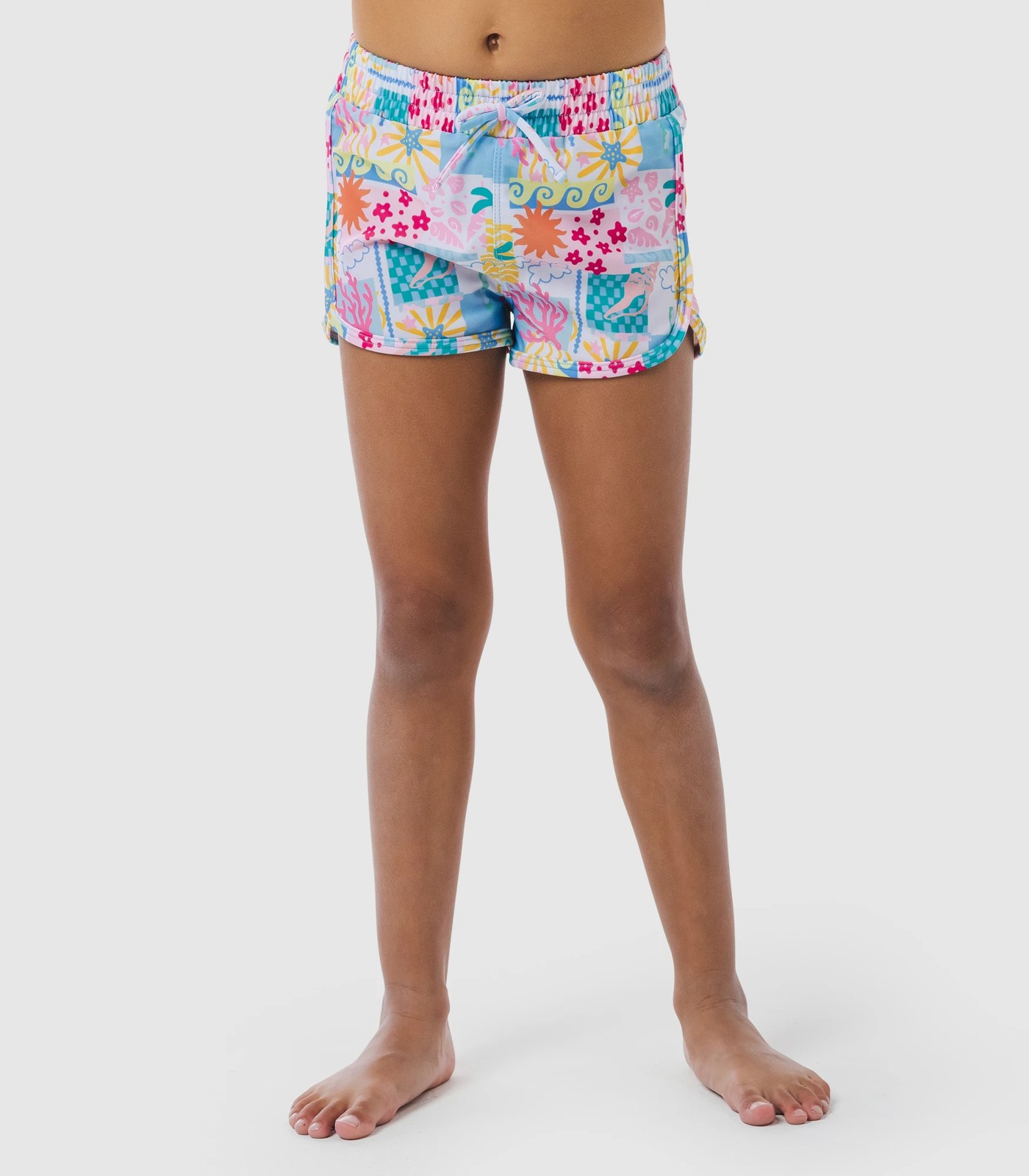 Easy wear swimshorts for the pool and the beach featuring a playful tile print and scalloped hem detail. Made with recycled polyester as part of Piping Hot's commitment to ocean protection. Pair with matching surfsuit for swim outfit.