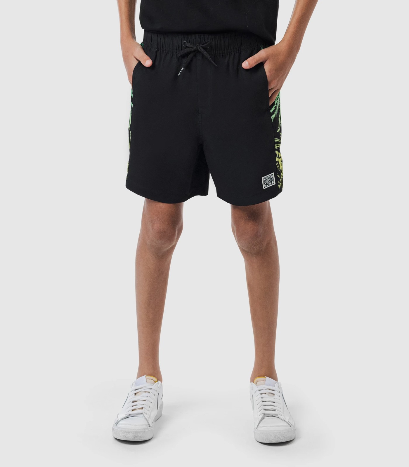 Easy wear volley shorts for the pool and the beach featuring a tropical print and black panelling. Made with recycled polyester as part of Piping Hot's commitment to ocean protection.