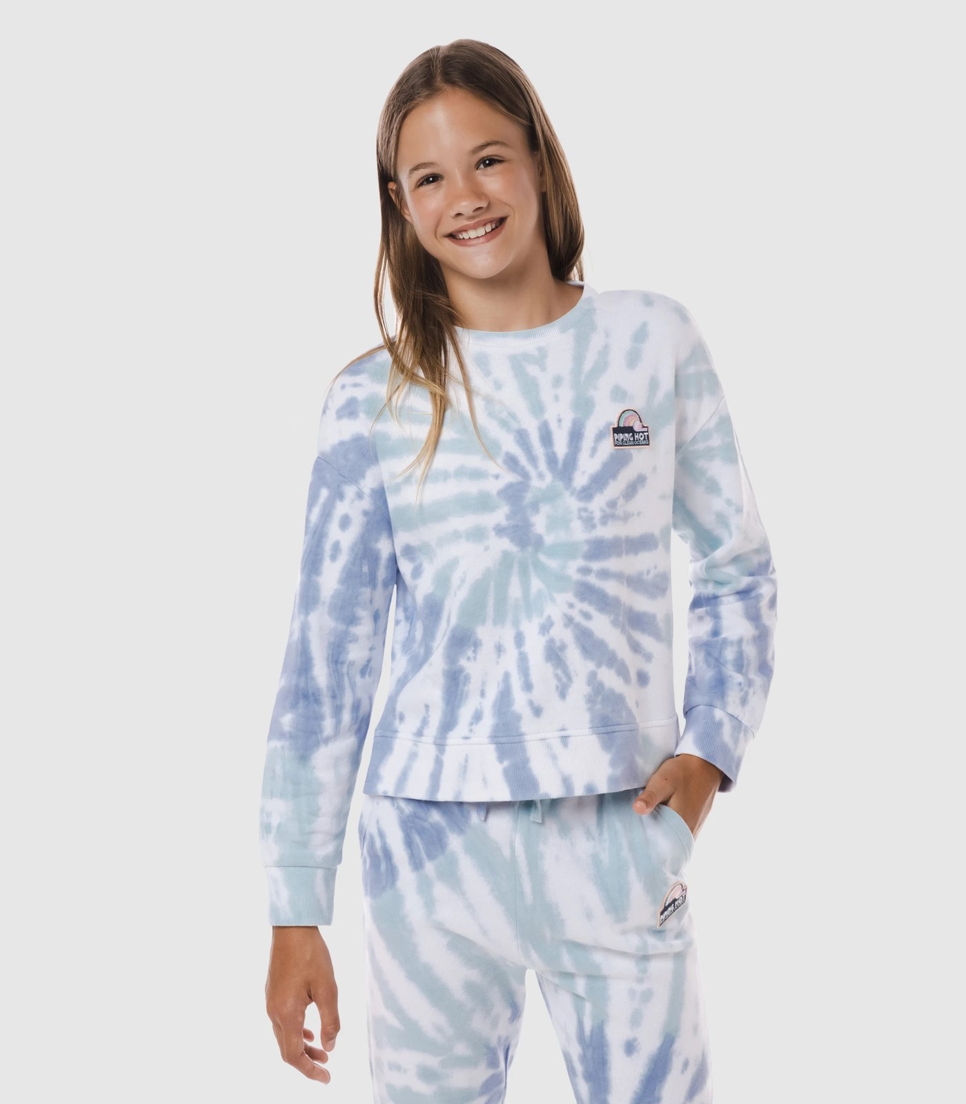 Combine style and function with this blue crewneck. Featuring a tie-dye wash and a vintage-inspired Piping Hot embroidery on the front chest. Made with breathable cotton for comfort and easy care.