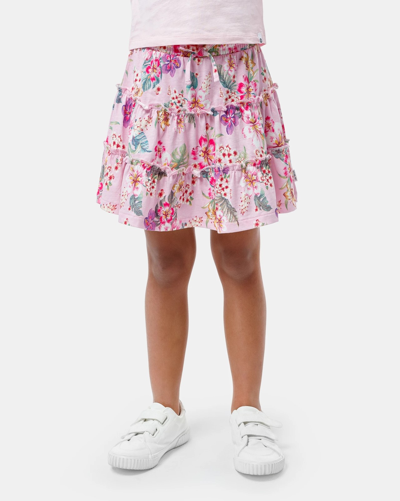 This Piping Hot floral pink skirt features a layered hem detail with ruffles making it pretty but practical in breathable cotton. Girls will love how comfortable they are, with an elasticated waist making them an easy pull-on style.