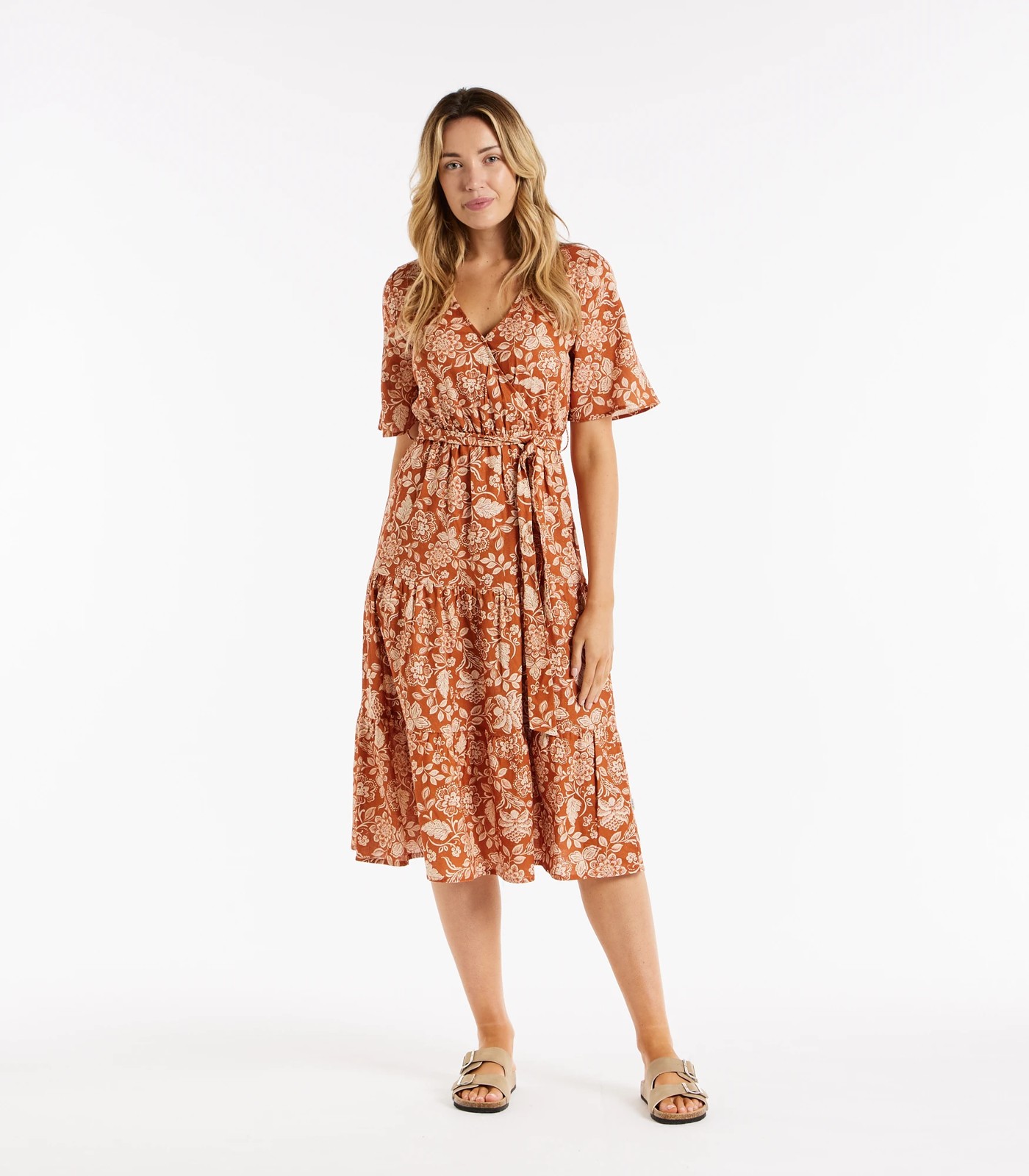Introducing the perfect summer dress for any occasion: our Piping Hot Wrap Midi Dress. This eye-catching linen-viscose blend dress is designed with a rust boho floral print that will have you turning heads all season long! The flutter sleeves and elasticated waist create an effortless fit, while the waist tie detail and tiered skirt add a touch of femininity. With its flattering midi length, this dress is sure to become your go-to for any summer event. Make your fashion statement with our Piping Hot Wrap Midi Dress!