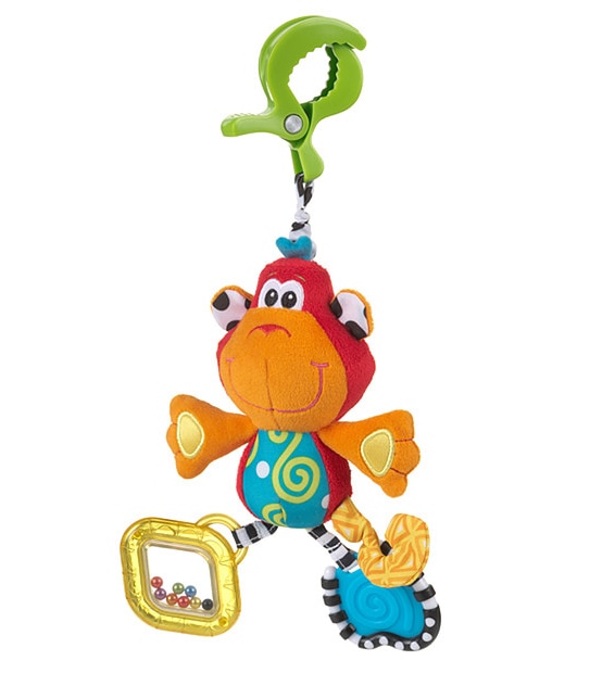The perfect travel companion - Playgro Dingly Dangly with it's mix of plush, satin and woven ribbed fabrics creates interest and encourages tactile development. The vibrant colours are engaging and it features a rattle on one foot and teether on the other. The clamp easily attaches to most prams and strollers.