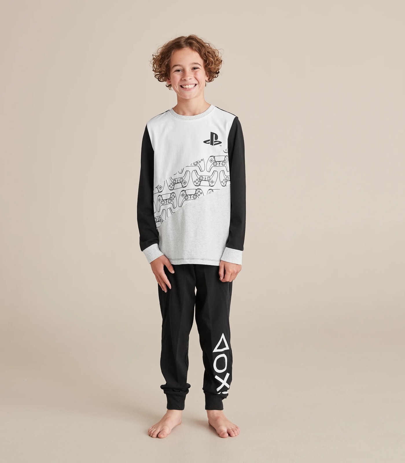 Gaming fans will sleep blissfully in the Playstation Cotton Pyjama Set, featuring a long sleeve top with spliced Playstation design to front and matching black pants with Playstation print down leg.