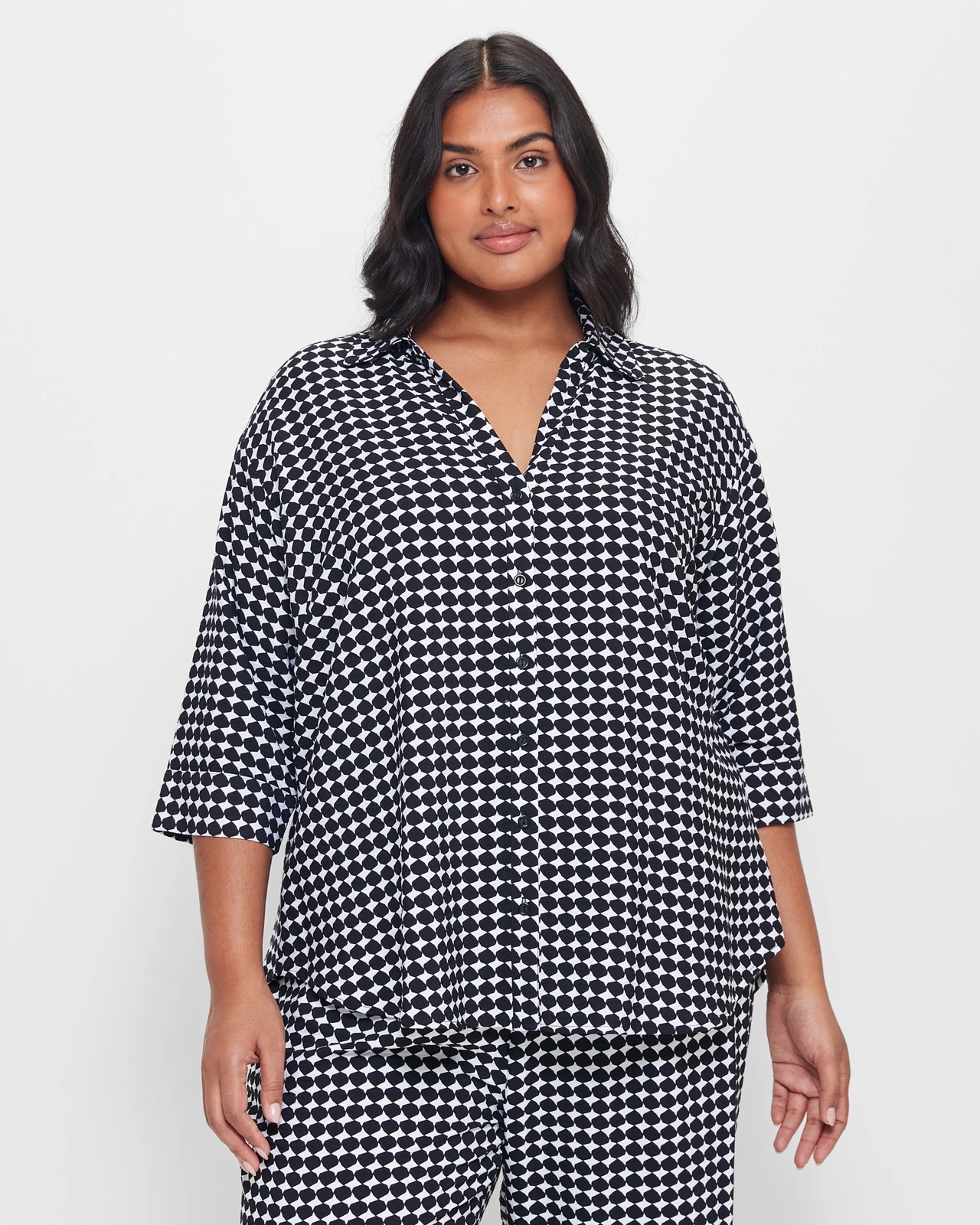 Discover the elegance of our Plus Size shirt! Embrace your curves in style with its flattering regular fit and eye-catching black and white geo print. The shirt features a round collared neckline with a v-drop front, along with fashionable cuffed sleeves. Crafted from a premium viscose/nylon blend, the shirt offers both comfort and sophistication. Don't miss out on the opportunity to elevate your wardrobe with a versatile piece that effortlessly transitions from day to night.