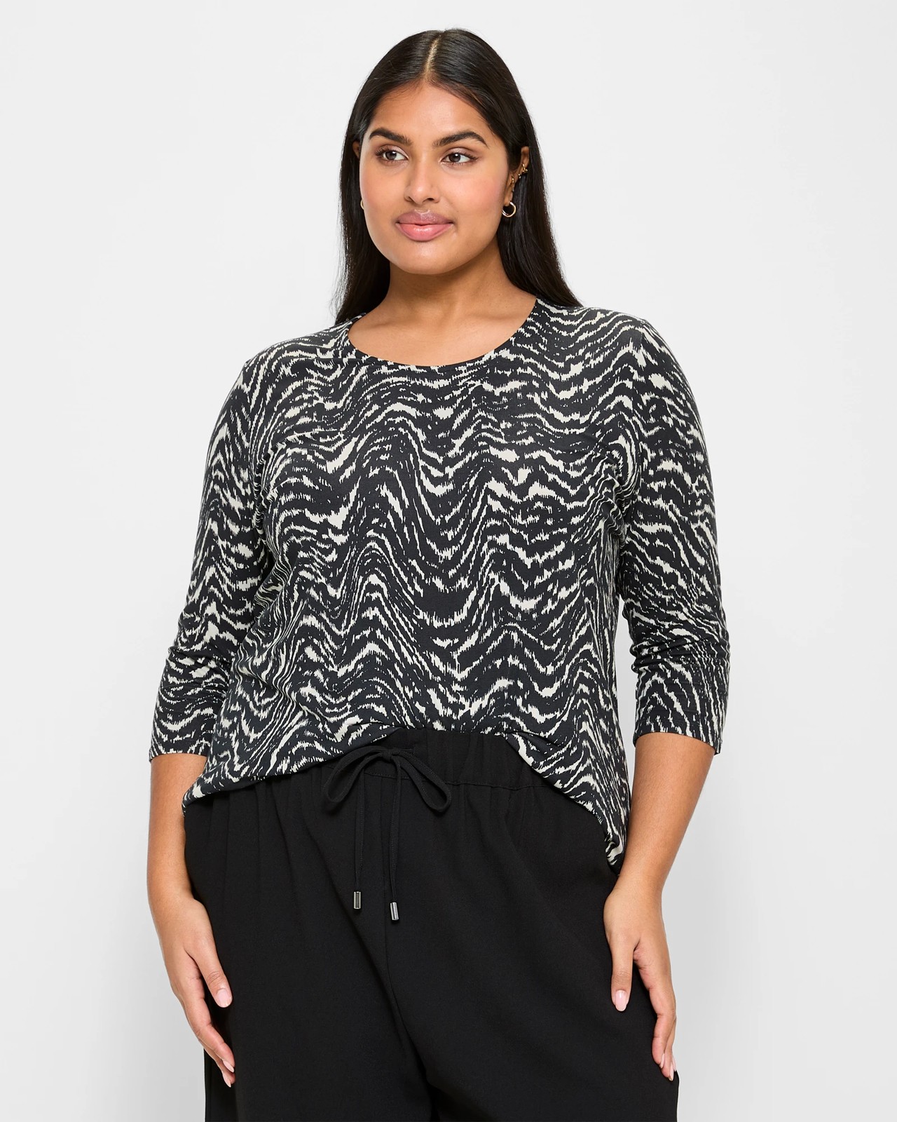 Embrace ultimate comfort and effortless style with our plus size swing top, featuring a soft viscose blend and stretchy elastane for ease. Ideal for any occasion, the scoop neckline and timeless black print will enhance your wardrobe. This striking piece will have you looking and feeling amazing. Treat yourself today and experience a blend created for you.