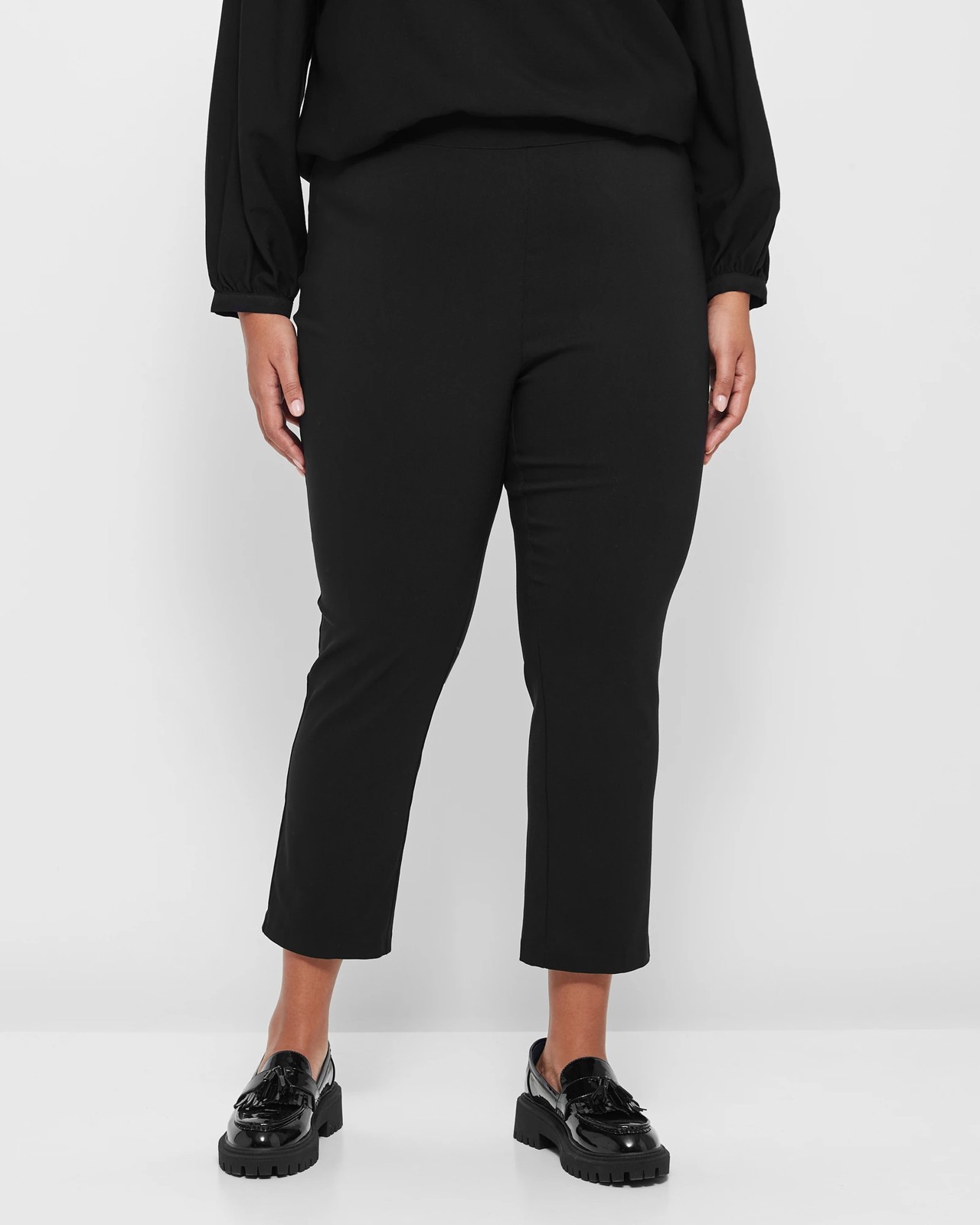 Welcome to everyday comfort with our Plus Size Bengaline Pants. Crafted from a soft viscose/nylon blend, these pants offer the perfect balance of stretch and style. The regular fit, elastic waistband, and tapered leg ensure a flattering silhouette for all-day wear. In classic black, these ancle-length pants are versatile for any occasion. Elevate your wardrobe with the essential addition of our Bengaline Pants.
