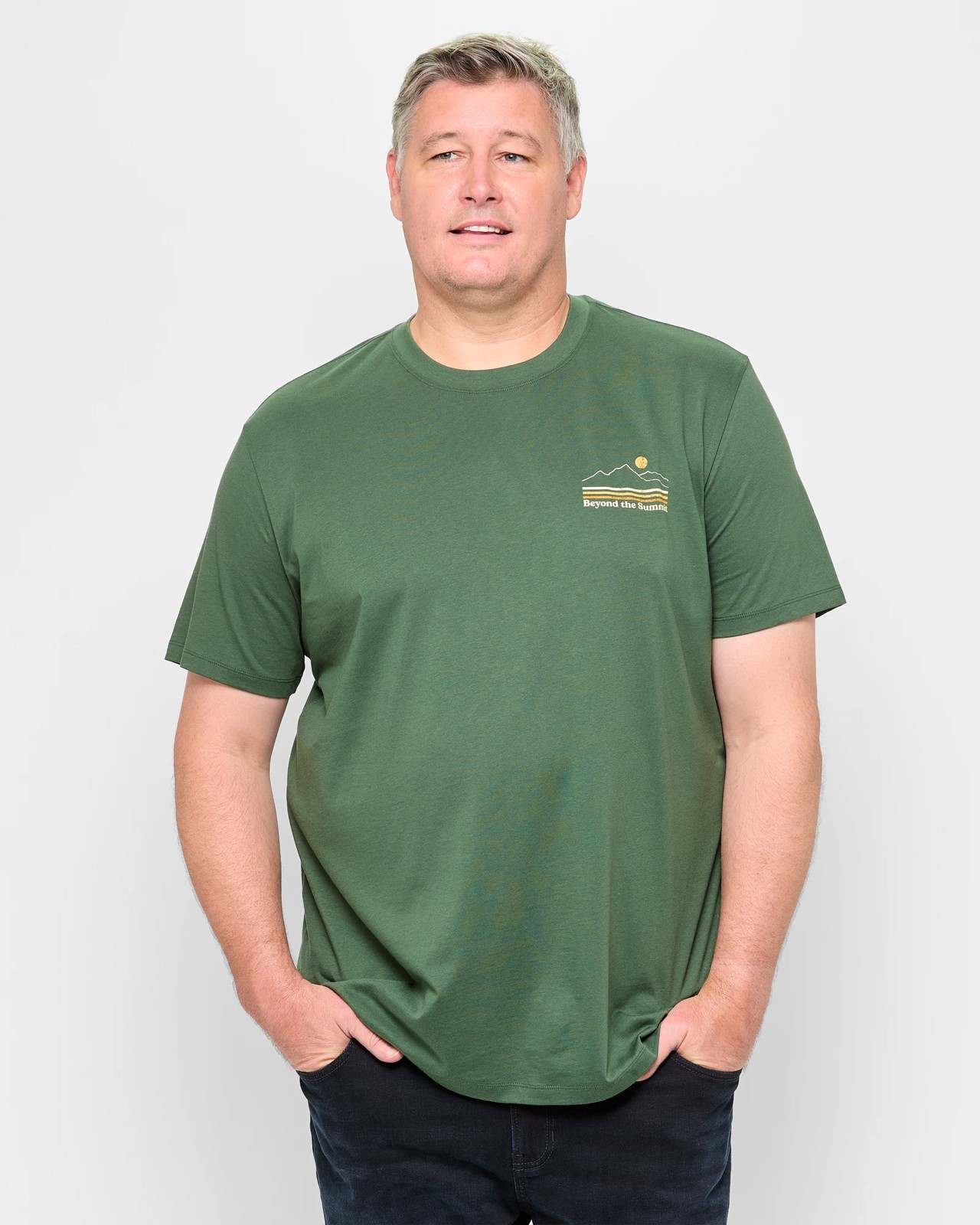 Our Men's Plus Size T-Shirt is designed for comfort and style, made from high-quality Australian cotton. This winter green shirt features a regular fit, ribbed crew neckline, and short sleeves. The unique 'BEYOND THE SUMMIT' print on the chest and the bold design on the back add a fashionable touch. With its straight hemline, this lightweight t-shirt is perfect for everyday wear. Add it to your wardrobe for a blend of style and comfort. Make it yours today!
